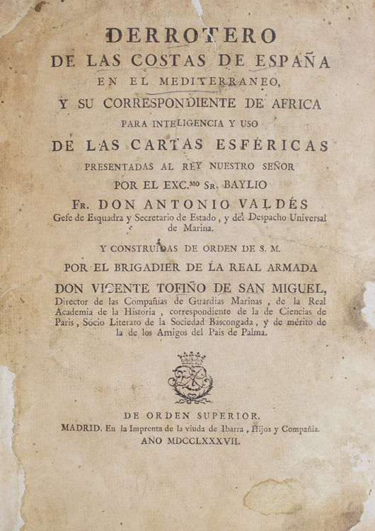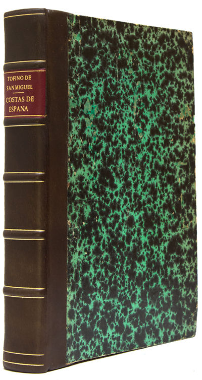Madrid: Viuda de Ibarra, Hijos y Compañia, 1789. First edition. [vi], lviii, [ii], 227, [1, errata] ; [ii], xvii, [i], 247, [1] pp. 1 vols. 8vo. Recent quarter brown calf, red morocco spine label, and ninteenth century marbled boards. First title page browned, with some marginal flaws, laid down (covering text on verso), light dampstain at lower corner of pp. xxvii-lviii. Very good. First edition. [vi], lviii, [ii], 227, [1, errata] ; [ii], xvii, [i], 247, [1] pp. 1 vols. 8vo. Navigation guide for the Mediterranean and Atlantic costs of Spain and North Africa. Tofino himself was a sailor and cosmographer. He participated in the expedition against Algiers and also in the siege of Gibraltar before turning his attention to this maritime atlas of Spain.
