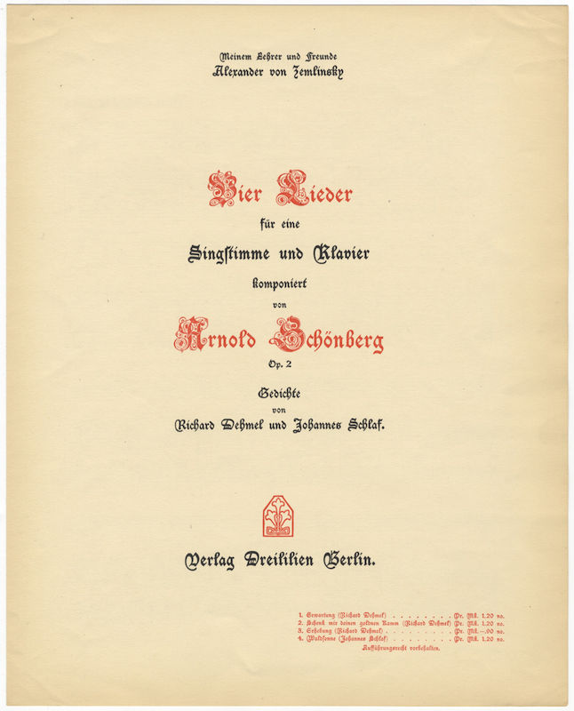 Berlin: Verlag Dreililien [PN 239], 1907. Folio. Original publisher's wrappers printed in red and black. [i] (title printed in red and black), 2-3, [i] (publisher's catalogue: "Werke von Arnold Schönberg" listing opp. 1-4 and 6-7) pp. Price printed to lower right corner: no. 1 "Mk. 1.20 no.," no. 2 "Mk. 1.20 no.," no. 3 "Mk. –.90 no.," no. 4 "Mk. 1.20 no." Watermark "CGR X64X."