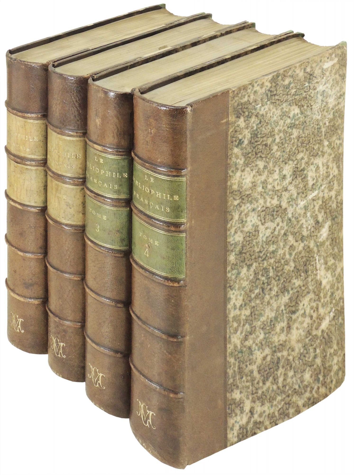Paris: Librairie Bachelin-DeFlorenne, 1869. Hardcover. Very Good. Hardcover. Four volumes of the seven total of this important French bibliophilic publication that appeared from 1867-1873. The volumes are impressive collections of articles and illustrations of important figures, subjects such as bindings and heraldry, and much more. There are numerous illustrations throughout each volume, most in black and white but occasionally in color. Bound in quarter brown leather with raised bands to spine with green leather title and volume number labels in compartments. Bumping and some chipping. Marbled paper boards with some light scrapes and bumping. Volume I has some dampstains, some intermittent brown spots on a few pages. Volume III has tape repair to bottom corner of front board. "Cercles Malesherbes" on title page and a few other random pages. Bookplates of previous owners on front endpapers. Very good condition. Volume I: 416 pages; Volume II; 396 pages; Volume III: 384 pages; Volume IV: 384 pages. This set may require an extra shipping fee. BOB/043015.
