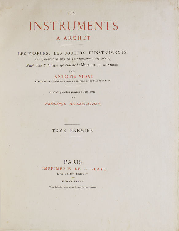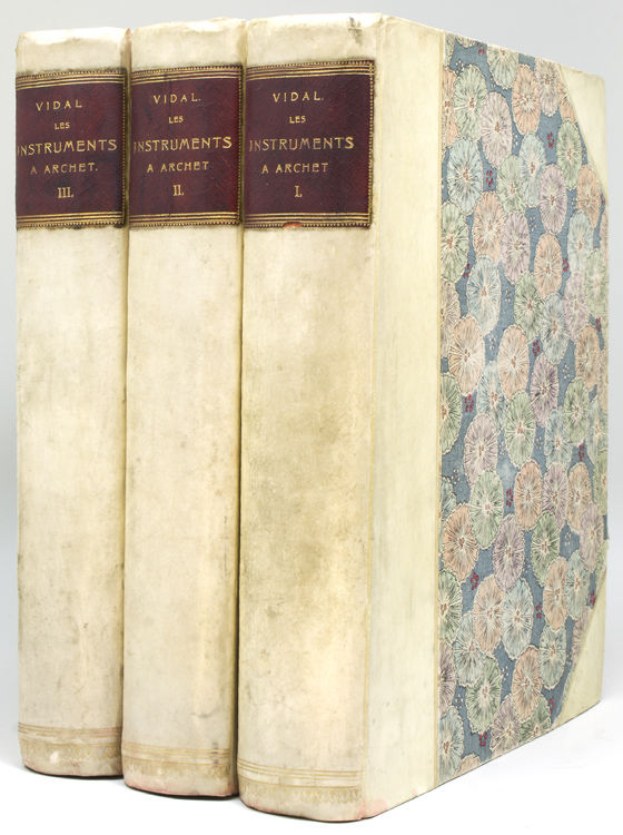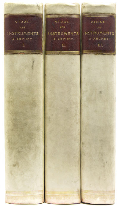 Paris: Imprimerie de J. Claye, 1876. First edition, one of 500 copies. 118 engraved plates. 3 vols. 4to. Contemporary half velum and decorated paper boards, red morocco spine labels. Light soiling to covers, sporadic foxing, an attractive set. Large etched bookplate of Gustav Frid in each volume. First edition, one of 500 copies. 118 engraved plates. 3 vols. 4to. A beautiful, uncut set of this landmark work on the history of the violin. “This is, beyond the possibility of doubt, the greatest work ever published, or which is ever likely to be published, on the violin” (Fidiculus Bibliographia). Fidiculus Bibliographia 191