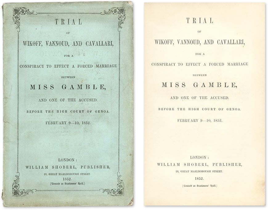 1852. Vannoud, Louis; Cavallari, Luigi. Vannoud, Louis; Cavallari, Luigi. A Sensational Case of Kidnapping [Trial]. Wikoff, Henry [1813-1884], Principal Defendant. Vannoud, Louis, Defendant. Cavallari, Luigi, Defendant. Trial of Wikoff, Vannoud, And Cavallari, For a Forced Marriage Between Miss Gamble and One of the Accused. Before the High Court of Genoa, February 9-10, 1852. London: William Shoberl, 1852. 64 pp. Lithograph portrait frontispiece of Wikoff. Octavo (8-1/2" x 5-1/2"). Stab-stitched pamphlet in printed wrappers. Moderate soiling, rubbing to extremities with some wear to spine ends and corners. Light toning to text, foxing to a few leaves, internally clean. $750. * Only edition. An account of one of the sensational trials of the early 1850s. Wikoff, or as he called himself, Chevalier Wikoff, was an American impresario, occasional European correspondent for the New York Herald and, possibly, a spy for Lord Palmerston. He was engaged to Jane Catherine Gamble, an English woman. Gamble changed her mind shortly before the wedding and fled to Genoa. Wikoff tracked her down and apparently tricked her into coming along with him to his apartment. Shortly afterwards Gamble filed a complaint of kidnapping that landed Wikoff in an Italian jail for 15 months. He was found guilty in an Italian court and forced to return her letters and "extorted promise of marriage." Ever enterprising, Wikoff responded to the negative publicity with a memoir entitled My Courtship and Its Consequences (1855), which became a best-seller. Copies of The Trial of Wikoff are scarce. OCLC locates 7 worldwide: 2 in the British Library and 5 in North American law libraries (Harvard, Library of Congress, University of Georgia, University of Minnesota, University of Pennsylvania).