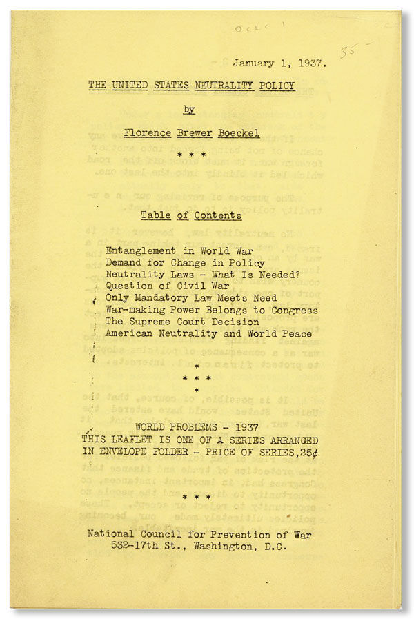 Washington DC: National Council for Prevention of War, 1937. First Edition. Octavo (21.5cm.); original staplebound self-wrappers; 15pp.; printed from typescript on yellow stock. A bit unevenly toned, else About Fine. "World Problems - 1937. This leaflet is one of a series arranged in envelope folder..." - upper wrapper. A short bibliography on neutrality dated December 1, 1936, and printed from typescript on orange stock laid in. Outline for the prevention of the United States entering a second World War, by the Director of the Council. Wisconsin Historical Society only in OCLC as of May, 2015.