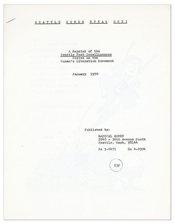 Seattle: Radical Women, 1970. Quarto (28cm.); [14] staplebound leaves; title page printed from typescript, the remainder consisting of reproductions of illustrated newspaper articles appearing in the Seattle Post Intelligencer, January 18-25, 1970. Very minor toning to extremities, else About Fine. 5 copies located in OCLC as of May, 2015, none in the state of Washington.