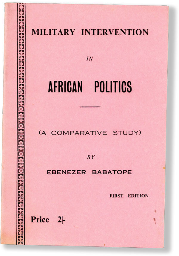 [Iponri, Lagos: Progressive Outlook Printers], 1971. First Edition. 12mo (18cm.); original pink decorative staplebound wrappers; [2],24pp. A touch dust-soiled, with slight fading along spine, else Near Fine. Produced in the tradition of Nigerian market literature, this provides brief accounts of countries in which the army had to take over the government. Includes sections on Nigeria, Ghana, Congo, Upper Volta, Central African Republic, United Arab Republic, Sudan, Mali, Libya, Uganda, Algeria, Togo, and Sierra Leone. HOGG 331.