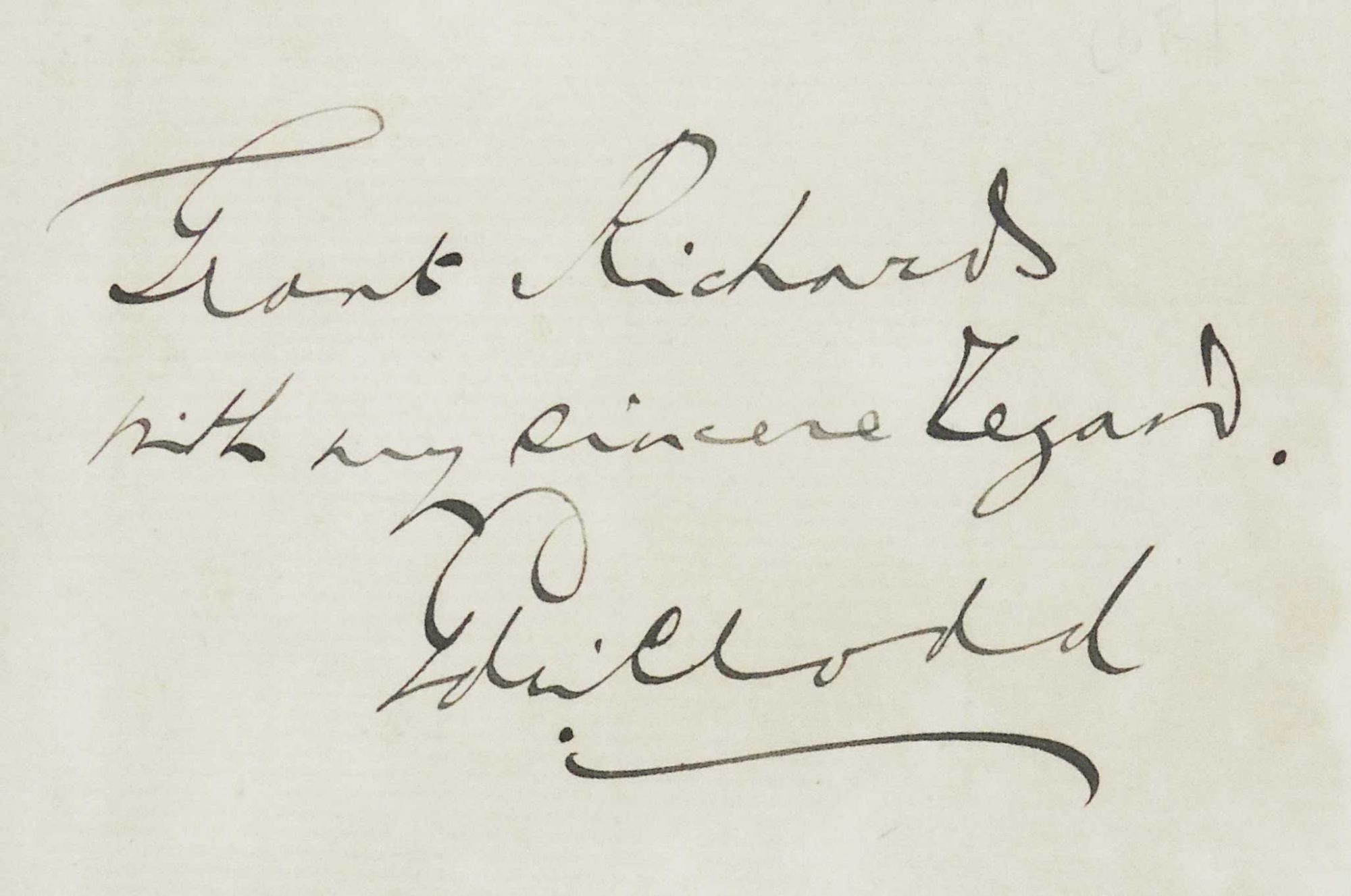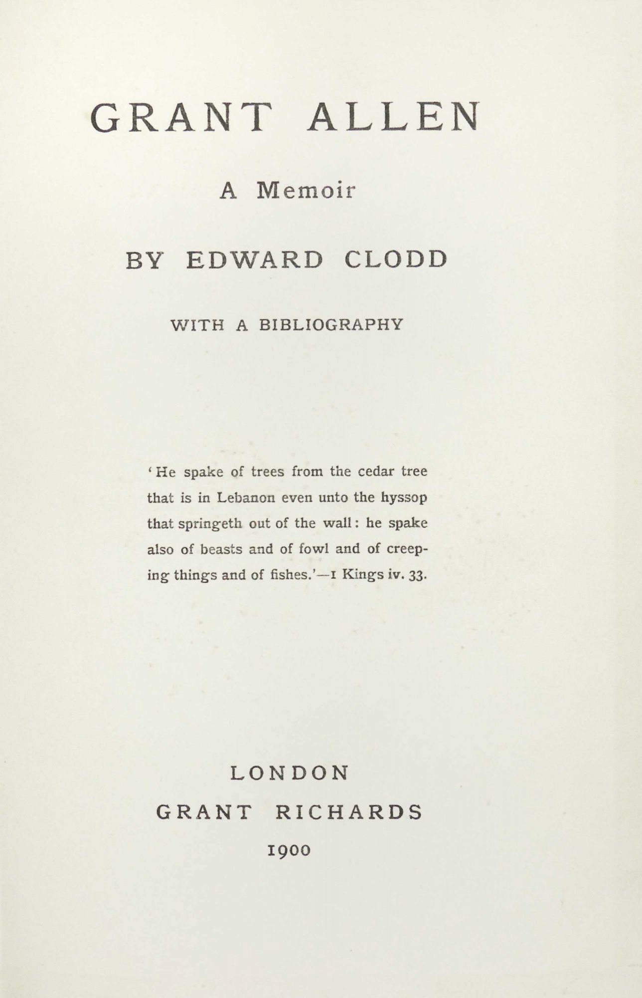 London: Grant Richards, 1900. Hardcover. Very Good. Hardcover. First Edition. Presentation copy from Clodd, inscribed to the book's publisher Grant Richards, the nephew of Grant Allen. This memoir celebrates the life of Canadian science fiction author Charles Grant Blairfindle Allen (1848 - 1899). After teaching in grade school for several years, he became a professor of moral philosophy in Jamaica, where he developed his evolutionary system of philosophy. His literary career began with non-fiction essays on popular science, and he later went on to write nearly 30 fiction novels. He is considered to be a pioneer of the science fiction and detective fiction genres. Bound in original dark brown cloth boards with gilt title to spine. Minor sunning to spine, small chip to foot of spine, and a few spots to boards. Offsetting to endpapers, else clean. 222 pages. LIT/052115.