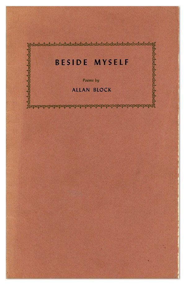 New York: Flatiron Press, 1962. First Edition. Octavo. Printed wrappers; [iv, 16pp]. Inscribed inside front wrapper to the Greenwich-village folk-music impresario Izzy Young, dated 1962. Mild discoloration to front wrapper, else Fine. A significant association, joining two of the great figures of the 1960s folk revival. Allan Block (1923-2013) was the long-time proprietor of the Allan Block Sandal Shop, on West 4th Street, which would become one of the twin hubs of the Greenwich Village folk scene of the Sixties. The other hub was Izzy Young's Folklore Center, located a few blocks away on MacDougal Street, and performances from either venue were known to disperse from one locality only two coalesce at the other; Bob Dylan, Ramblin' Jack Elliott, Geoff and Maria Muldaur, Dave Van Ronk, and a host of others were frequent visitors to both venues. This book scarce, as are all of Block's early collections published under the "Flatiron Press" imprint.