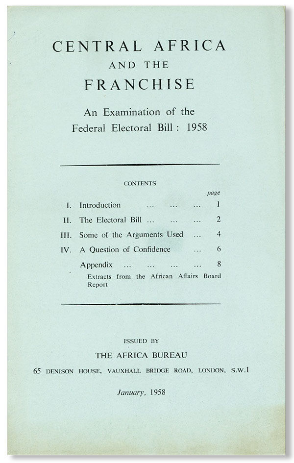 London: Africa Bureau, 1958. First Edition. Octavo (20cm.); original blue staplebound self-wrappers; 11pp.; printed entirely on blue stock. Extremities a bit toned, else Very Good. Price cancel inside upper wrapper. Regarding suffrage in Northern Rhodesia and Nyasaland.