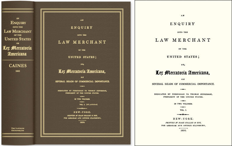 2006. ISBN-13: 9781584776796; ISBN-10: 158477679X. The First American Treatise on Commercial Law [Caines, George (1771-1825)]. An Enquiry into the Law Merchant of the United States; Or, Lex Mercatoria Americana, on Several Heads of Commercial Importance. Dedicated by Permission to Thomas Jefferson, President of the United States. In Two Volumes. Vol. 1 [all published]. Originally published: New York: Printed by Isaac Collins & Son, For Abraham and Arthur Stansbury, 1802. xxxviii, [2], 648; clxvii, [1] pp. Reprinted 2006 by The Lawbook Exchange, Ltd. ISBN-13: 9781584776796. ISBN-10: 158477679X. Smythe sewn, attractive dark brown cloth hardcover with glit stamped spine and front cover. New. $150. * Reprint of the sole edition. With an appendix of forms. As Horwitz points out in The Transformation of American Law, this is the first American treatise on commercial law (150). Surrency's History of American Law Publishing notes that it was also the first to deal with admiralty law (441). It focused on shipping and maritime commerce, with substantial sections on insurance and bankruptcy. Reflecting the tension that existed between arbitrators and courts of law, Caines insisted that "in what appertains to trade, let it be constantly remembered, that custom alone is law" (220). Caines [1771-1825] was the official reporter of the New York Supreme Court.