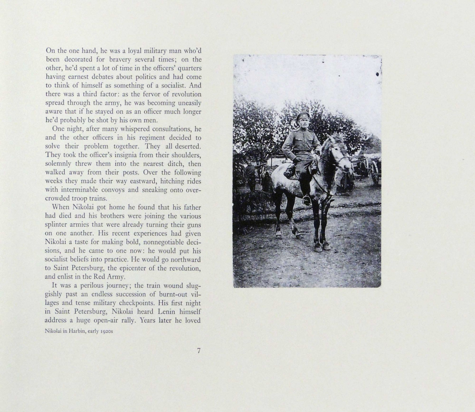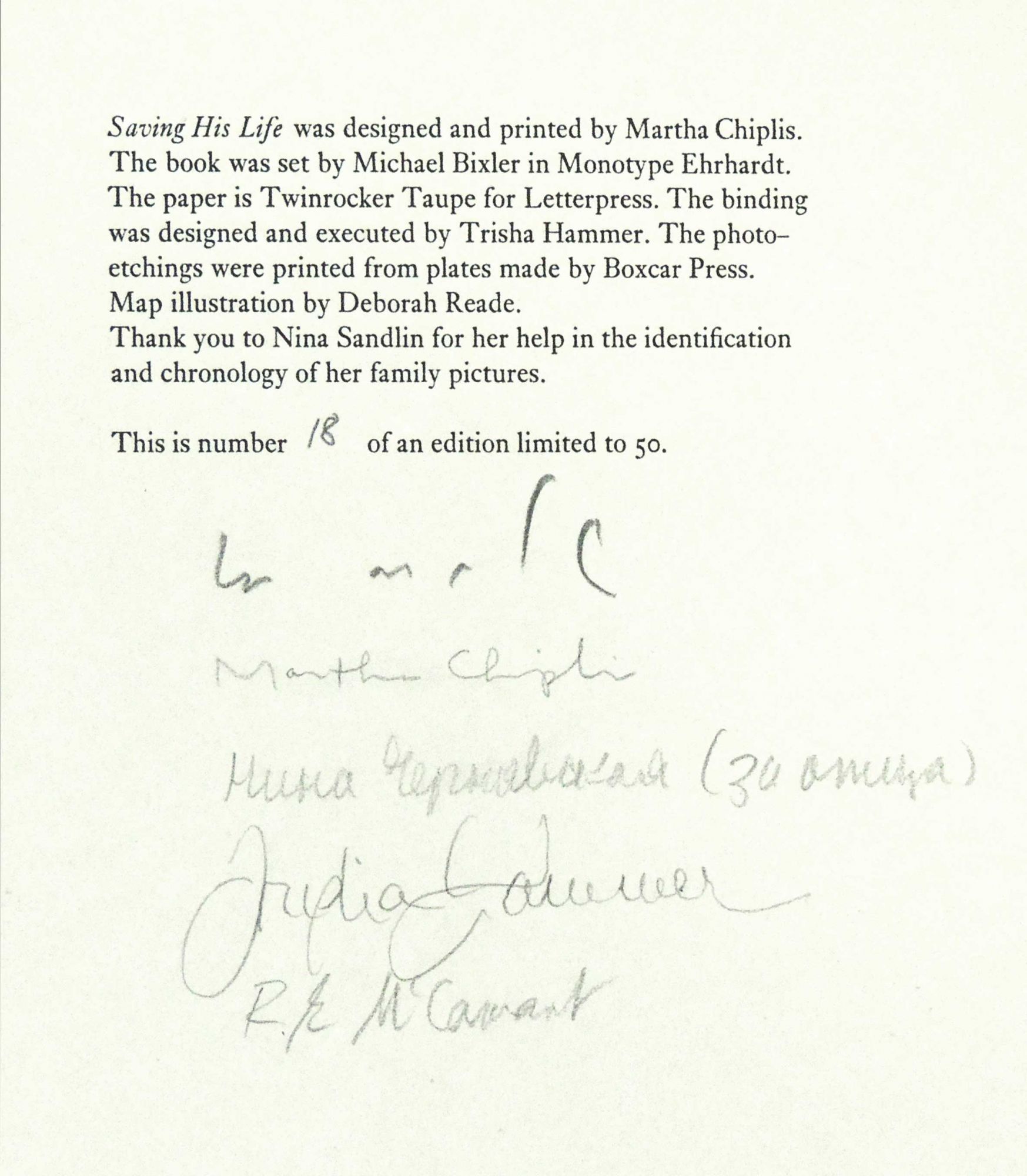 Chicago: Sherwin Beach Press, 2008. Hardcover. Fine. Hardcover. Number 18 of 50 copies. Signed by the author and the bookmakers. With numerous family photographs provided by Nina Sandlin. Lee Sandlin (1956-2014) was an award winning journalist and essayist. This is his story of the extraordinary life and bewildering illness of Sandlin's father-in-law, Russian immigrant Nick Cherniavsky (1924-2007), who grew up in China. "The defining event of Nick’s life happened before he was born. The Russian Revolution was one of those vast historical calamities that most Americans have been spared: it was a time when people who never thought of themselves as political, who never thought they’d have to choose sides about anything, were forced to make political choices that could easily cost them their homes, their families, and their lives. This was how it was for Nick’s parents." This beautiful book iwas designed by Martha Chiplis, set in Monotype Ehrhardt by Winifred and Michael Bixler, and printed by Martha Chiplis on handmade Twinrocker Taupe paper. Photoetchings from family photographs are printed on Hosho, inset into the book in debossed panels. A map of Nick's lifetime of travel, drawn by Deborah Reade, serves as the front endpaper. Trisha Hammer has designed and executed a hidden crossed-structure binding in Nigerian goatskin with endpapers of Japanese silk, housed in a silk drawstring bag. An impressive production In fine condition. 9 1/2 x 11 x 2 inches. 100 pages. PRI/072115.