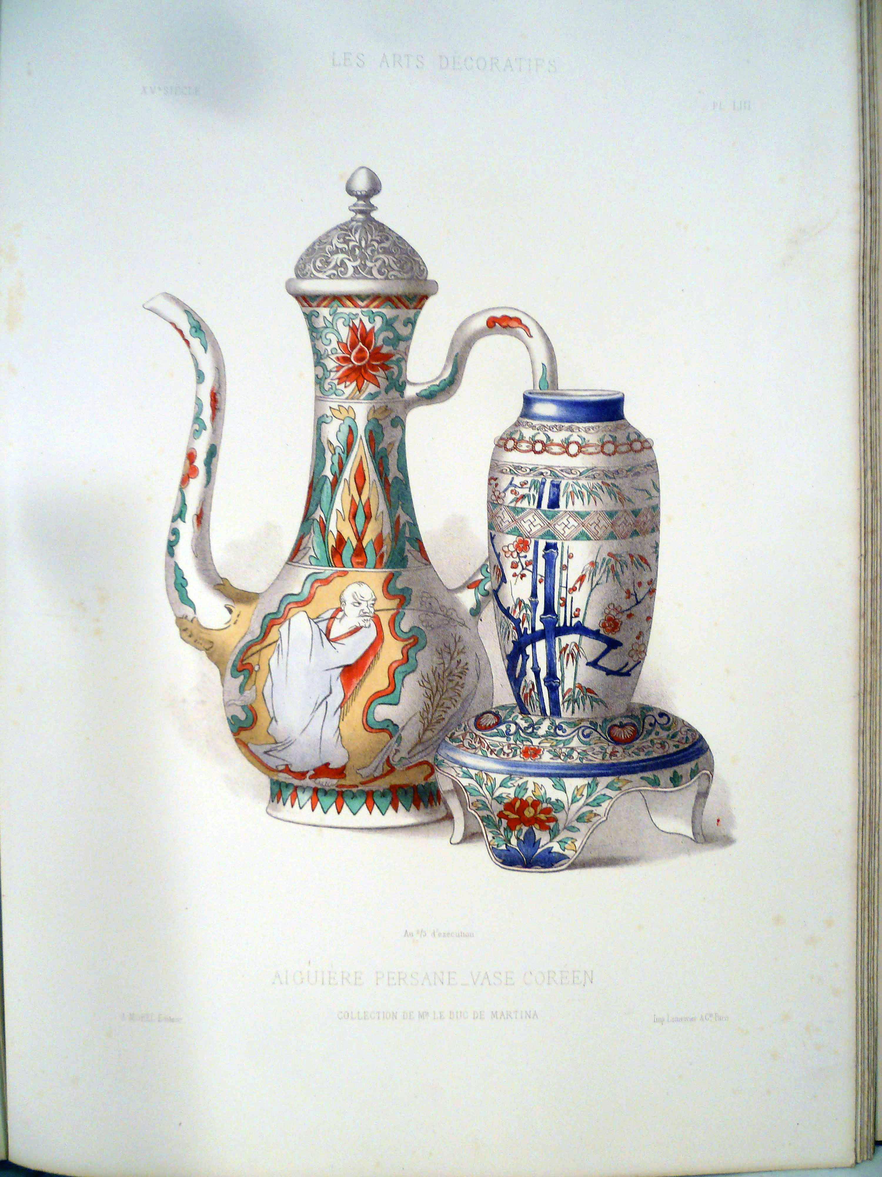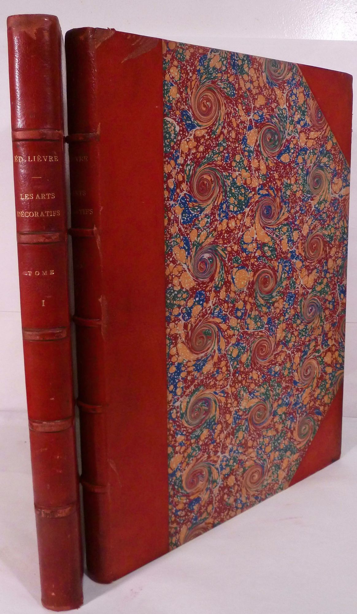 Paris: Morel, 1870. First edition. leather_bound. Contemporary red half morocco and marbled boards, marbled endpapers. Very good. 2 vols. 4 pages in text. Folio, 44.2 x 33.3 cm. 120 plates comprising 100 chromolithographs and 20 engraved plates. Half-title, title page and some text printed in red and black, Arranged in chronological order, the collection of vibrant printed color plates traces a history of decoration and ornament including textiles, ceramics, glass, wood and metal. This work was an important during the preparation of the Paris Exhibition in 1878, being a highly influential publication in dispersing Japanese and Eastern styles as inspiration for Impressionism and Art Nouveau. The author, a cabinet maker and decorator is noted for his Wardrobe "Japanese style" that was sold at 2.036 million pounds sterling at auction at Bonhams (London) in Dec. 12, 2008, beating the world record for a piece of furniture of the 19th century. Some light marginal spotting, rubbing and scuffing to leather, the marbled boards fresh and bright.