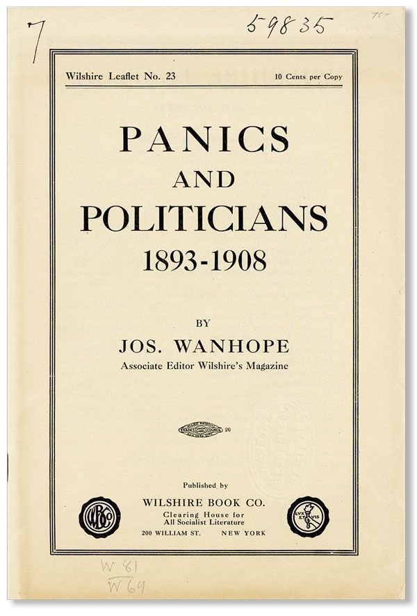 New York: Wilshire Book Co, 1908. First Edition. Octavo (23cm.); staplebound self-wrappers; 19pp.; photographic illus., text in double columns. Ex-Hartford Theological Seminary with their pressure stamp to both wrappers, wrappers a bit toned with some wear from handling, else Very Good. Wilshire Leaflet no. 23. Published the same year Wanhope appeared on the Socialist ticket for Governor of New York. Not in Egbert.