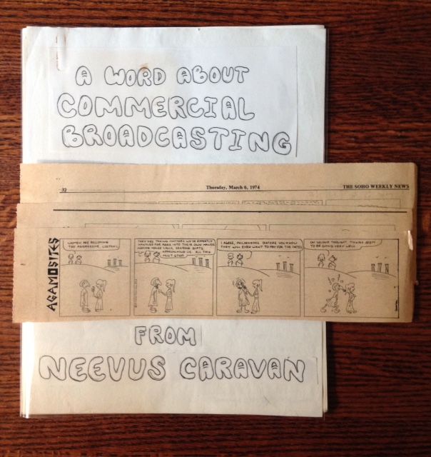 Nick Gavrilou, 1972. Original wraps. Near Fine. Very scarce mock-up of an early 70s intended book on working the system thru television--and making it a more democratic and responsive tool. Written and illustrated by Nick Gavrilou, who had a comic strip for years in The Soho Weekly News called "Agamosites" (several examples of which are included with this mock-up). 14 loose 8 1/2" x 11" sheets (which are held together by mylar), the text and illustrations for the most part pasted-on. Also includes an original Valentine card and handwritten note from the author. A nice example of original early 70s "radical" journalism, focusing in this case on television as one of the main culprits of society's ills.
