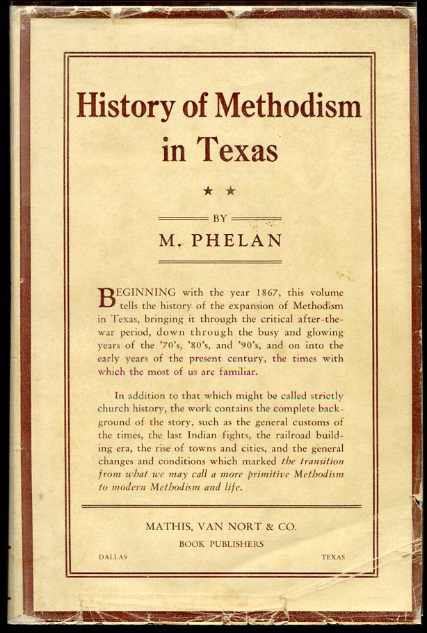 Dallas: Mathis, Van Nort & Co, 1937. The 1937 1st edition of this uncommon study of early religious history in Texas. Clean and Near Fine in a bright, VG dustjacket, with light, inconspicuous staining to the inside of the jacket which has bled just a bit thru to the spine. A bit of light creasing as well and very light chipping at the panel edges. Still though, attractive and very presentable. Thick octavo, 525 pgs.
