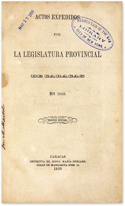 1859. Caracas in the Mid-Nineteenth Century [Venezuela]. Actos Expedidos por la Legislatura Provincial de Caracas en 1859. Edicion Oficial. Caracas: Imprenta de Jesus Maria Soriano, 1859. 61, [2] pp. [Bound with] Actos Expedidos por la Legislatura Provincial de Caracas en 1860. Edicion Oficial. Caracas: Imprenta de Jesus Maria Soriano, 1860. [ii], [67]-120, 1 pp. Octavo (8-1/2" x 5-1/2"). Later libarry cloth, red and black lettering pieces to spine. Moderate shelfwear and soiling, moderate toning to text, small inkstains and brief annotations to a few leaves. Ex-library. Small inkstamps to title page of first title. Solid copies of scarce titles. $300. * Only editions. These are two volumes of statute laws of the city of Caracas from a series that commenced in 1837.