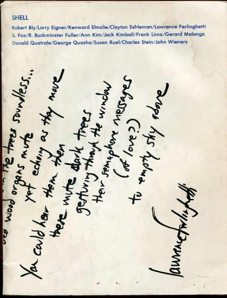 Waban, MA: Self-published, 1976. Original wraps. Very Good. The maiden issue of this poetry quarterly, edited by Jack Kimball and published in Waban, MA. Solid and VG in its printed wrappers, with light staining to the panel top-edges (only bleeding thru lightly to the front pastedown, title and copyright pages). Quarto, #315 of 600 copies issued. A Who's Who of contributors, including Robert Bly, Lawrence Ferlinghetti, Kenward Elmslie, Buckminster Fuller, Gerard Malanga, John Wieners, etc.