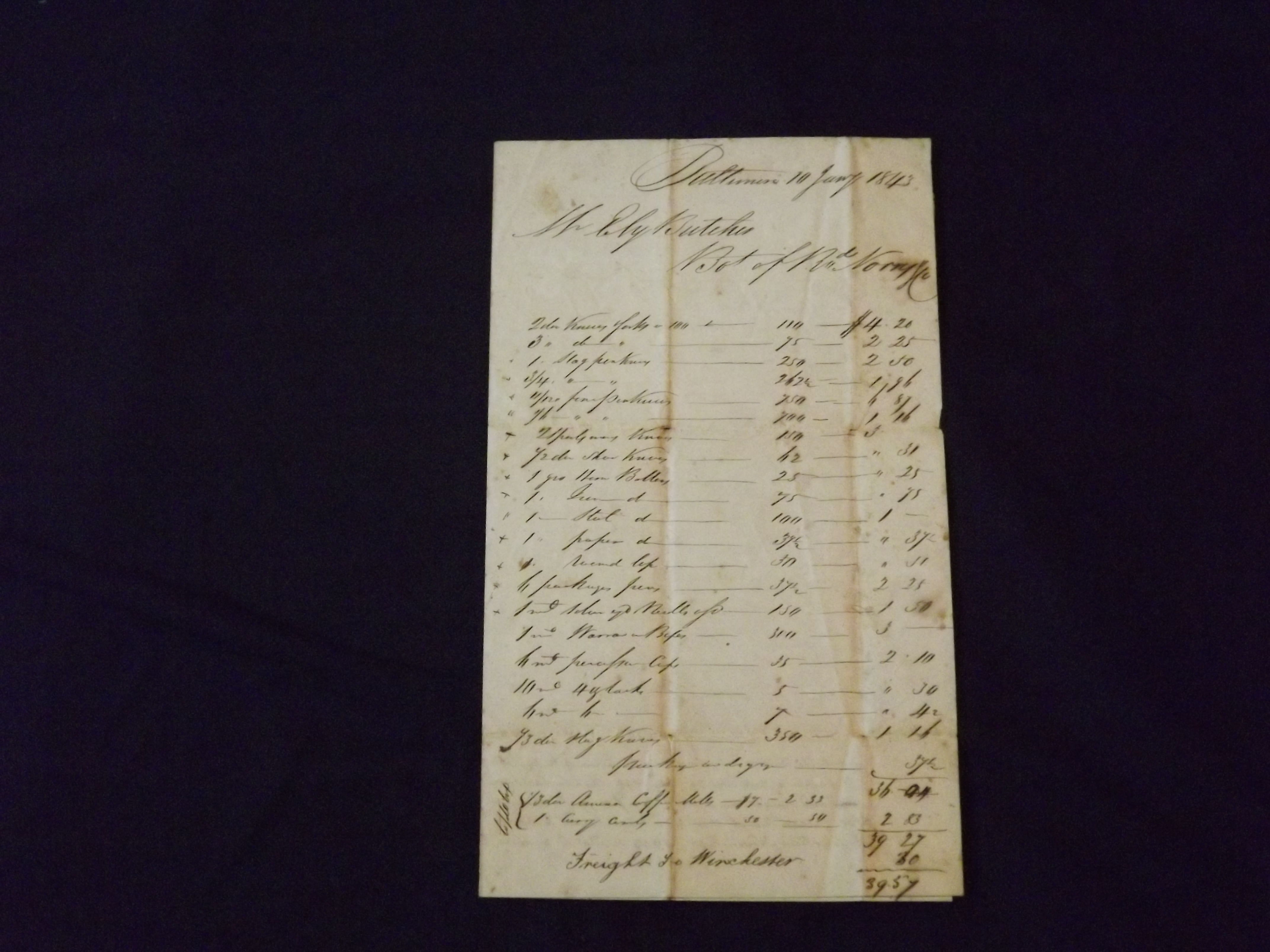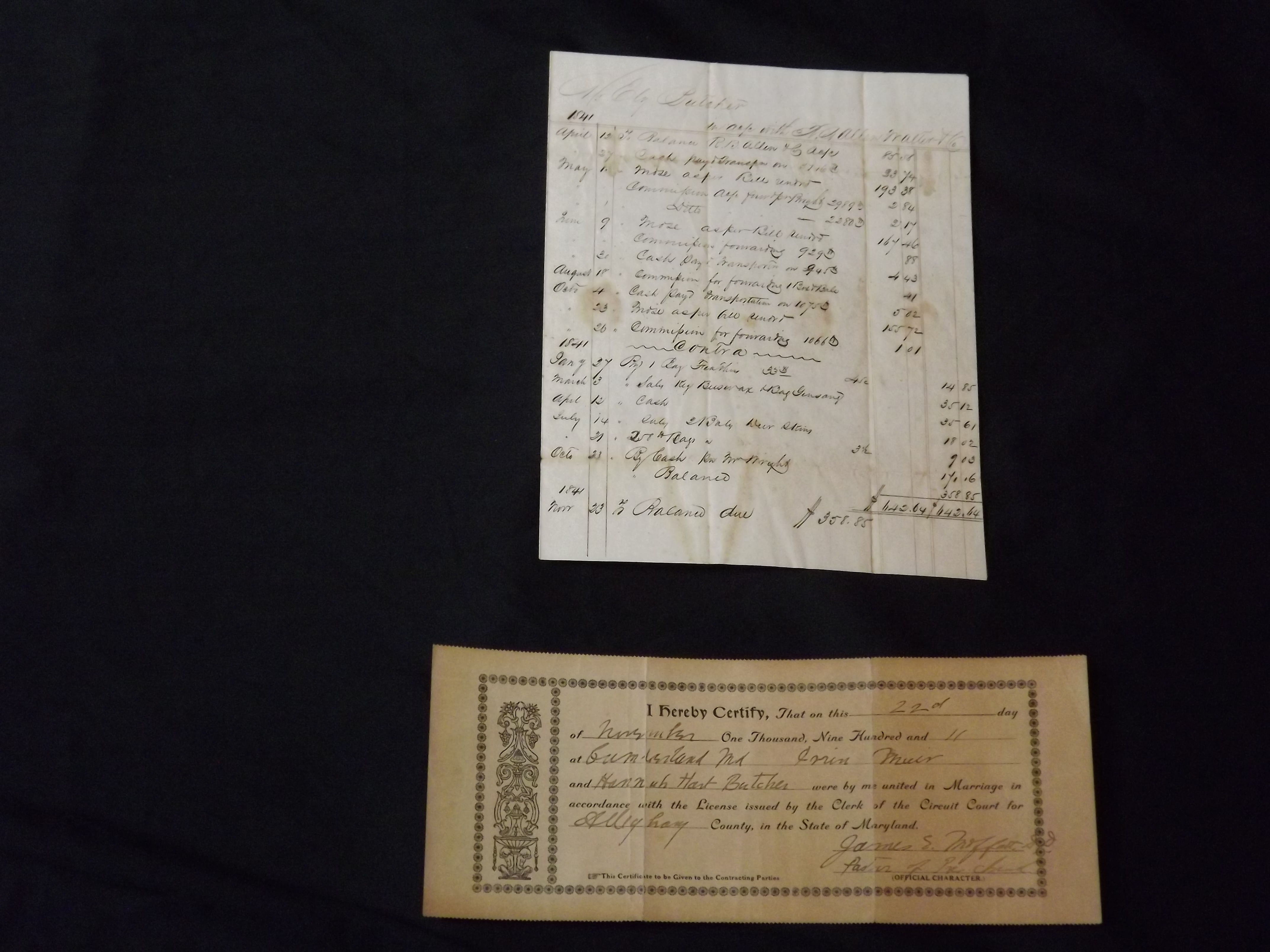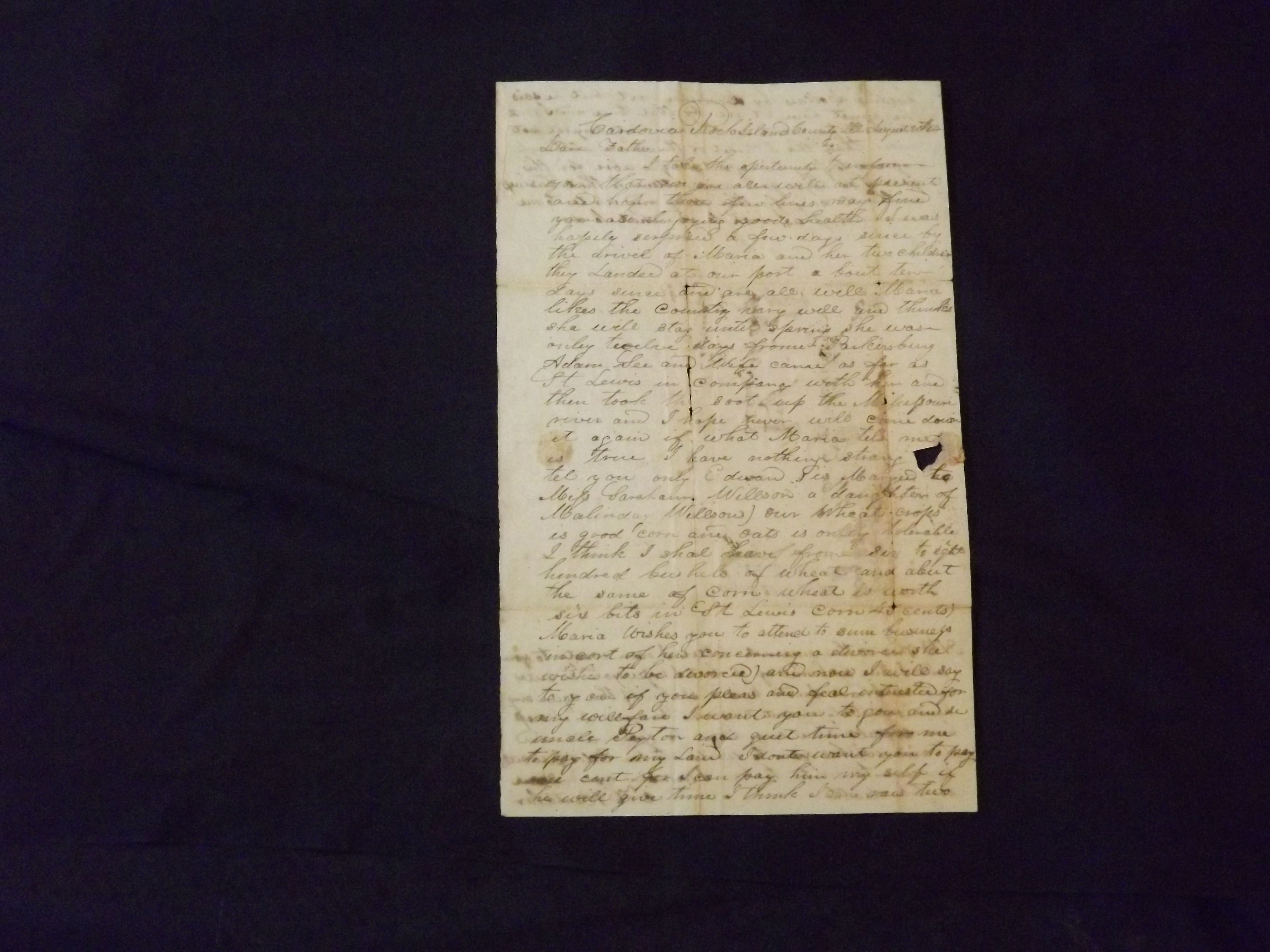 Small family archive of letters, 10 pieces in all, some folio size, other basic letter sheet size, over 20 pages of text, some docketed on reverse. Most pages are aged and browned, some chips and tears, a few holes at center folds, a little staining, but otherwise about very good. This family archive begins with a letter dated June 14, 1840, and provides a glimpse of life in still early America during the pioneer period. In the first letter, which is. from near Danville Missouri daughter Emily Lee and Adam Lee to father Ely Butcher in Randolph Virginia, asking for money. Emily complains about poor health, but tells him to consider moving out there where good land could be had. Another letter dated September 24, 1840 is from Rock Island County (Illinois), from John H. Butcher to his father Ely in Randolph Virginia. John Butcher a farmer tells his father he is in "tolerable good health", but talks about some hard times where he lives. He comments on the rivers being very low, and it appears his shipping costs were double what they should be. He stays he finds times very hard in this country, harder than expected, and adds he couldn't get $1000 for his home at that time. He even makes a comment about a split in government, but that the Whigs may feel they won (writing not totally clear on this comment). On January 2, 1842, from Danville Missouri, we see another letter from Emily Lee to her father Ely Butcher in Randolph Virginia. This letter has a sad tone, as Emily complains she hasn't gotten a letter from her father in almost two years, despite writing to him a few times. She says she feels neglected by her father and brothers, and times are very hard. She mentions store credit is not available, and they lost a horse. According to Emily her in-laws are no help, and she has eight children to take care of. She tells her father she will see him in the spring, and she expects him to do something about her situation. Seems like Ely's kids are often in need, and asking dad for help. On August 20, 1844 John Butcher In Rock Island Illinois to Ely Butcher in Beverly, Randolph County Virginia, appears to be visited by his sister, and his brother-in-law and sister Adam Lee and Emily lee. The farm is doing well, and he indicates that oat and corn prices are "tolerable", and he expects to produce 800 bushes of corn and wheat. It appears his sister wants a divorce, and it also appears John asks his father to intercede with his uncle Peyton about the land he uses. He seems to be tired of being a renter. He asks his father to negotiate a deal, and help him pay for it. He apologizes for the tone of the letter, but sounds a little desperate. There are also what appears to be some detailed receipts for the goods of Ely Butcher the dates appear to be 1842 and 1843. In fourth receipt the date is unclear, but could be as late as 1866. A final document is a marriage certificate for Hannah Hart Butcher, and the date is November 22, 1911.