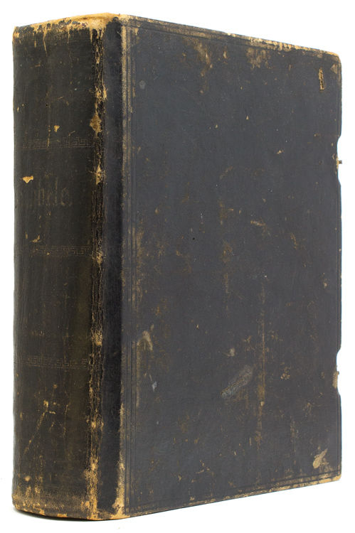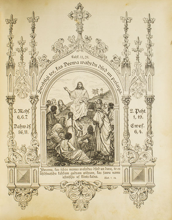 Jelgawâ [Mitau]: J.W. Steffenhagena, 1898. 16 (frontispiece and family record pages), [vi], 1120; [iv], 314, [2], 16 pp. 1 vols. 4to. Contemporary sheep, cover with blind-ruled borders, spine titled and decorated in gilt, clasps. Covers rubbed, gilt faded, dampstain to lower margin of preliminaries, paper toned and brittle with a some closed tears at margins. 16 (frontispiece and family record pages), [vi], 1120; [iv], 314, [2], 16 pp. 1 vols. 4to. OCLC: 1438105 (1 copy, Harvard University Divinity School); Darlow & Moule 6347?