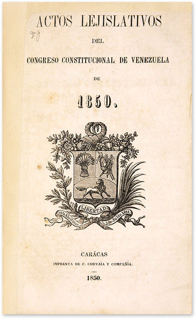 1850. 3 titles in one book.. 3 titles in one book. Framing Venezuela's Constitution of 1857 [Venezuela]. Actos Legislativos del Congreso Constitucional de Venezuela de 1850. Caracas: Imprenta de F. Corvaia y Compania, 1850. 101, [3] pp. [Bound with] Actos Legislativos Sancionados por el Congreso Constitucional de Venezuela de 1851. Caracas: Oficinas Tipograficas de Briceno y Campbell, 1851. 66, [3] pp. [And] Actos Legislativos Sancionados por el Congreso Constitucional de Venezuela de 1853. Caracas: Imprenta Republicana de Eduardo Ortiz, 1853. Octavo (8-1/2" x 5-1/2"). Later cloth, red and black lettering pieces to spine. Moderate shelfwear and soiling, moderate toning to text, small inkstains and brief annotations to a few leaves. Ex-library. Location label to spine, small inkstamps to title pages, annotations to versos. Solid copies of three scarce titles. $250. * Only editions. These are three volumes of decisions of the convention that framed Venezuela's 1857 constitution.