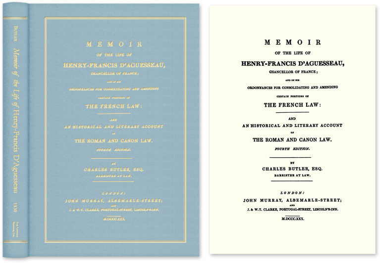 2008. ISBN-13: 9781584777465; ISBN-10: 158477746X. Butler, Charles. Memoir of the Life of Henry-Francis D'Aguesseau, Chancellor of France; and of His Ordonnances for Consolidating and Amending Certain Portions of the French Law; and An Historical and Literary Account of the Roman and Canon Law. Originally published: London: J. Murray: 1830. 207 pp. Reprinted 2008 by The Lawbook Exchange, Ltd. ISBN-13: 9781584777465. ISBN-10: 158477746X. Handsome smythe sewn, gilt stamped, cloth hardcover. New. $45. * This biography of the pioneering French codifier Henry-Francis D'Aguesseau, the first in English, was written at a time when the English and American legal communities were keenly interested in codification. Indeed, Butler [1750-1832] emphasizes this aspect of his subject's career. D'Aguesseau [1668-1751], a pupil of Jean Domat, served three terms as chancellor of France. He was renowned for his forensic eloquence and was a prolific legal writer. His attempt to codify French law was unsuccessful. This project led to several important reforms, however, especially in such areas as donations, testaments, succession and procedure. A prolific writer on legal and ecclesiastical subjects, Butler is best known for his completion of Hargrave's edition of Coke's Institutes, which are available as Lawbook Exchange Reprints.