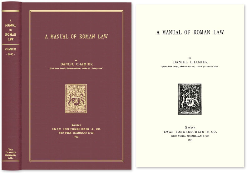 2007. ISBN-13: 9781584777472; ISBN-10: 1584777478. An Excellent Survey of Roman Law Chamier, Daniel. A Manual of Roman Law. Originally published: London: Swan Sonnenschein & Co./New York: Macmillan & Co., 1893. xii, 233 pp. Reprinted 2007 by The Lawbook Exchange, Ltd. ISBN-13: 9781584777472; ISBN-10: 1584777478. Attractive smyth sewn burgundy cloth bound hardcover with gilt stamped spine and front cover. New. $44.95 * Intended for law students who are busy but desire more than an outline of the subject, Chamier's manual offers a clearly focused survey with detailed discussion of Roman elements that are relevant to present-day common law. "The author, in some two hundred pages, clear both as to style and type, has lucidly explained the salient features of the Law of Persons, the Law of Things, and the Law of Actions. We have carefully perused the little book, and...we can speak highly of the manner in which the author has treated his well-worn subject.": Law Magazine & Law Review 20, 5th. Series (1894-1895) 273.