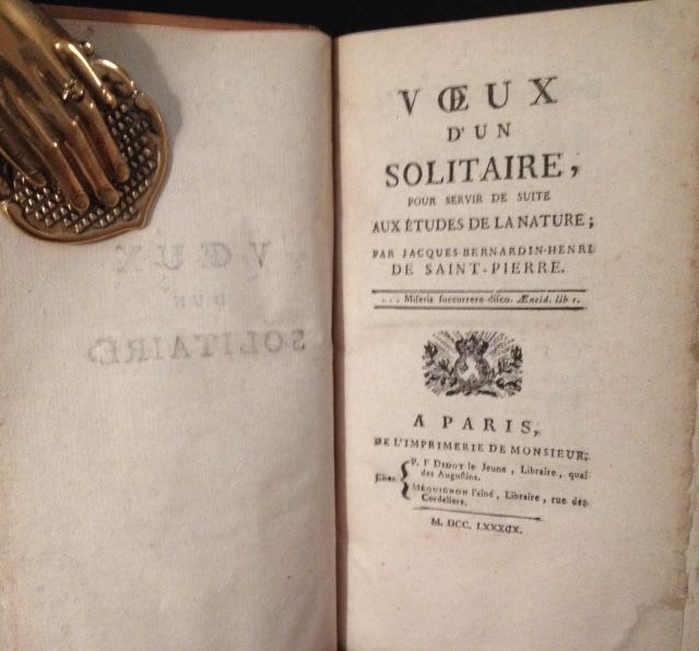 Paris: P.F. Didot, 1789. Hardcover. Very Good +. The 1789 1st edition, re-bound in simple tan boards (and new endsheets), with gilt-lettering along the spine. The wonderful original marbled wrappers are bound in as well. Clean and VG+, with just a touch of light foxing to the original text. 12mo, 218 pgs. Important late 18th century reflection on solitude.