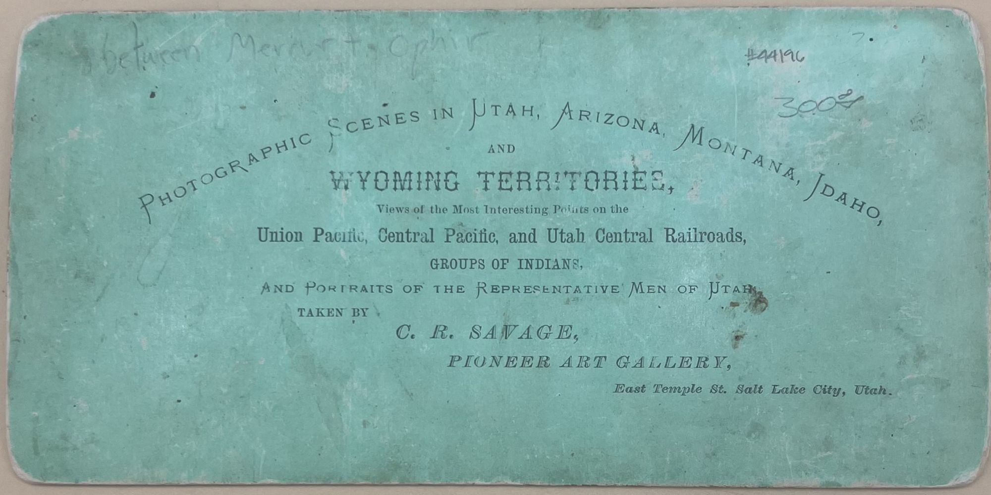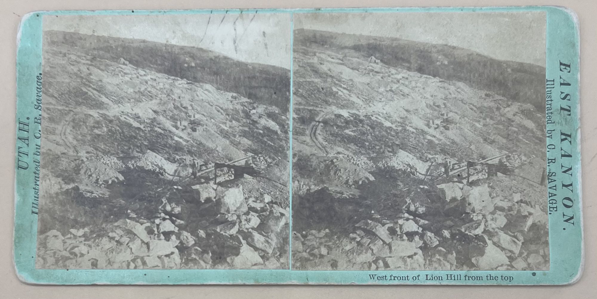 Salt Lake City, UT: C.R. Savage, Pioneer Art Gallery, 1870. Stereoview [17cm x 8.5cm] Green 'Utah Illustrated by Savage / Easy Kanyon' mount. C.R. Savage Pioneer Art Gallery backstamp. Very good. Gentle rubbing to corners of mount.