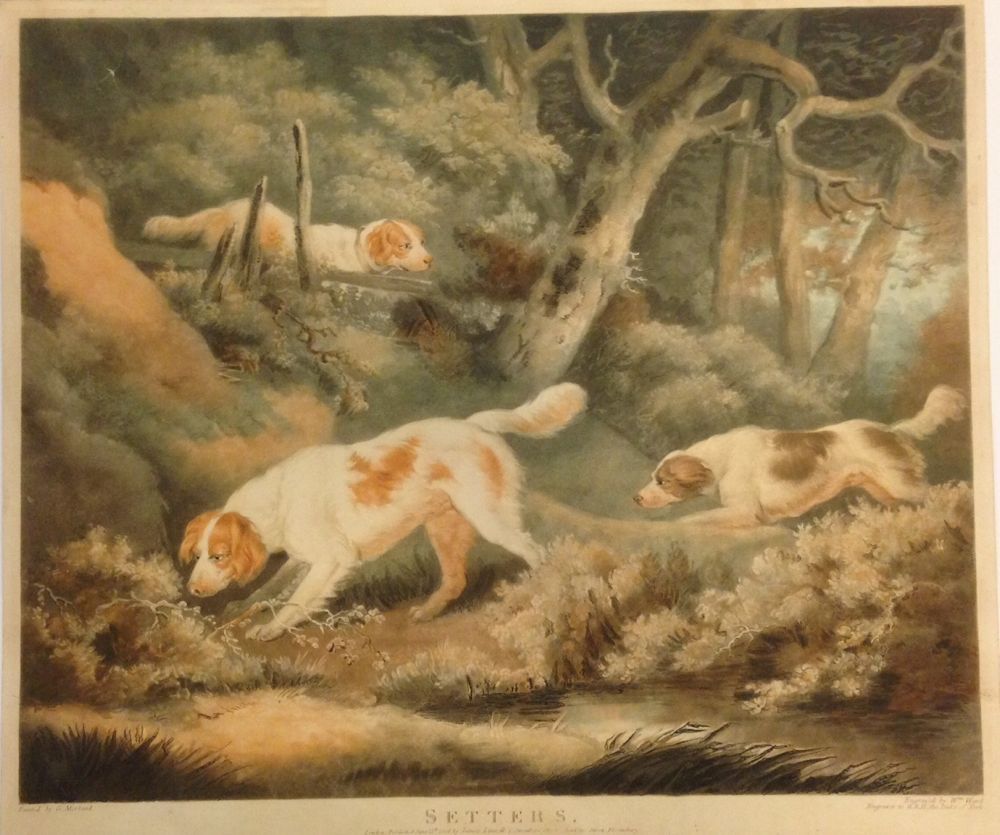 Beautiful aquatint engraved by William Ward (engraver to the Duke of York) in 1806 after painting by George Morland. Three dogs make their way through a forest scene. After George Morland (British, London 1763 -1804, London).