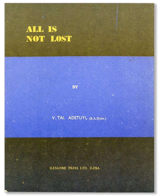 Ibadan: Adekile Goodwill Grammar School, [1973]. First Edition. Octavo (20.5cm.); original blue and black staplebound wrappers lettered in yellow and white; 49pp. Fine. Imprint on upper cover: Ilesanmi Press Ltd., Ilesa. 5-act play set in a polygamous home in Nigeria. Unlocated in OCLC as of September, 2015.
