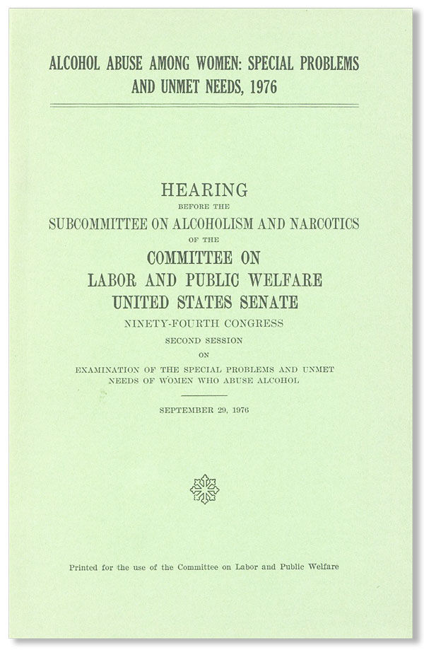 Washington DC: U.S. Government Printing Office, 1976. First Edition. Octavo (23cm.); original green printed wrappers; iv,421pp.; illus. Fine. Hearing before the ninety-fourth congress, second session, on the examination of special problems and unmet needs of women who abuse alcohol, September 29, 1976.
