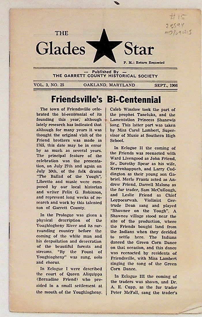 Oakland, MD: Garrett County Historical Society, 1966. Paperback. Very Good. Paperback. Published September 1966. Pages 433 - 448. Side-stapled wraps. Feature story is on Friendsville's Bicentennial. Includes list of deceased members, obituaries, weather news, new members, officers, annual dinner meeting report, Jarboe Family Notes, etc. Clean and bright. MD/090215.