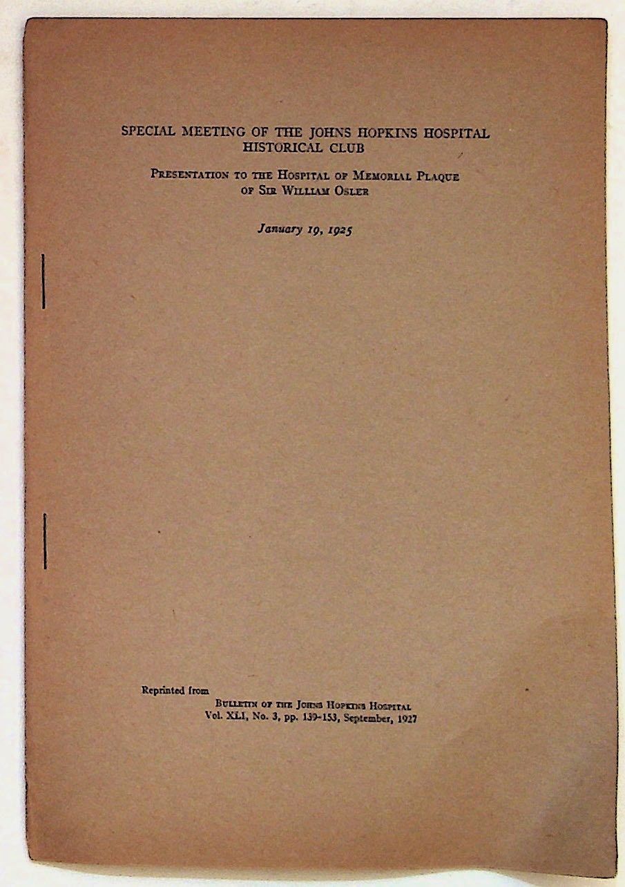 Special Meeting of the Johns Hopkins Hospital Historical Club: Presentation to the Hospital of Memorial Plaque of Sir William Osler, January 19 1925