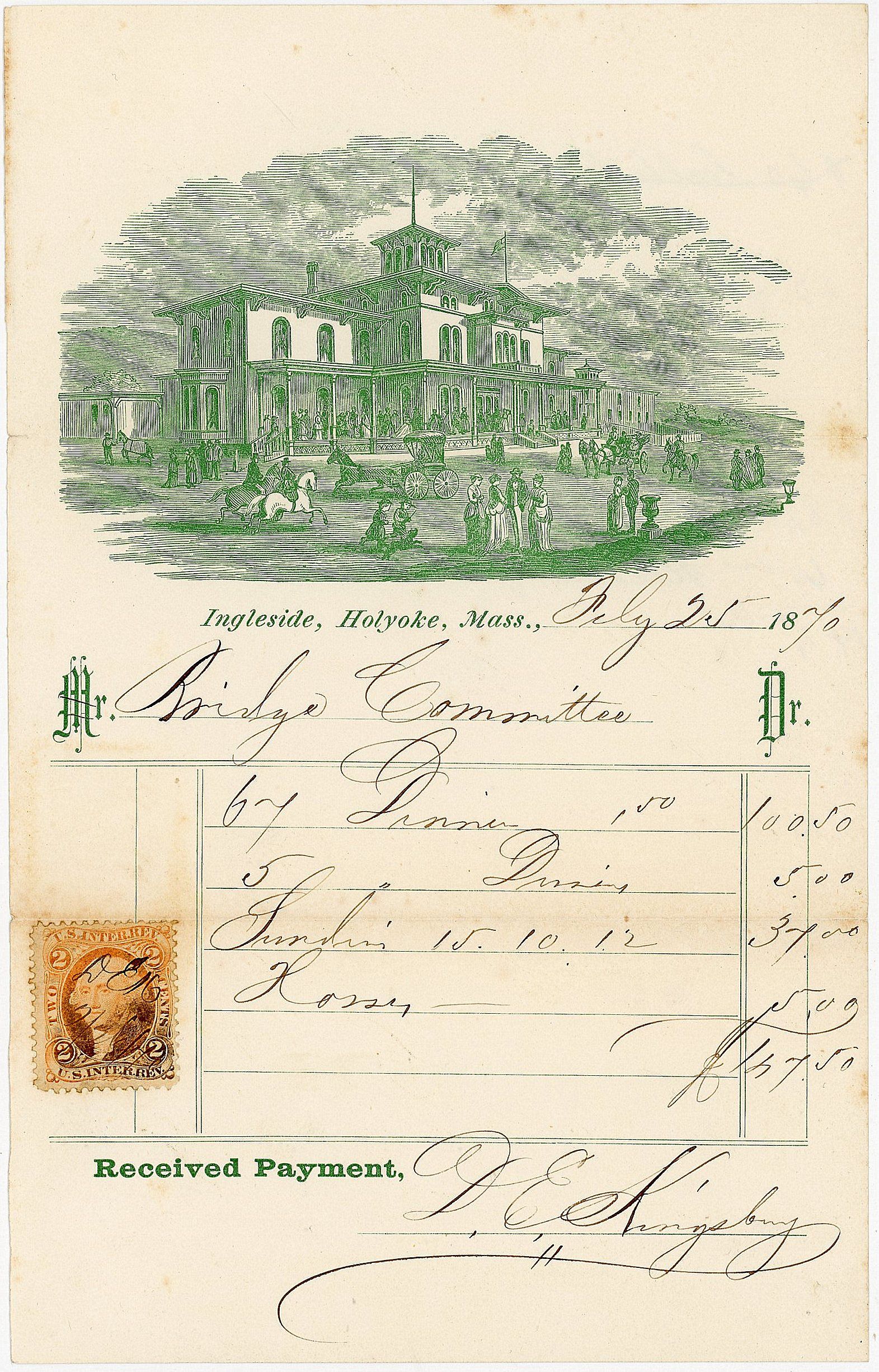 An 8" x 5" illustrated billhead from the Ingleside, Holyoke Mass. The fee is for Dining and addressed to the Bridge Committee. The bill head is printed in green ink with a fine illustration of the exterior of the establishment including the street scene.
