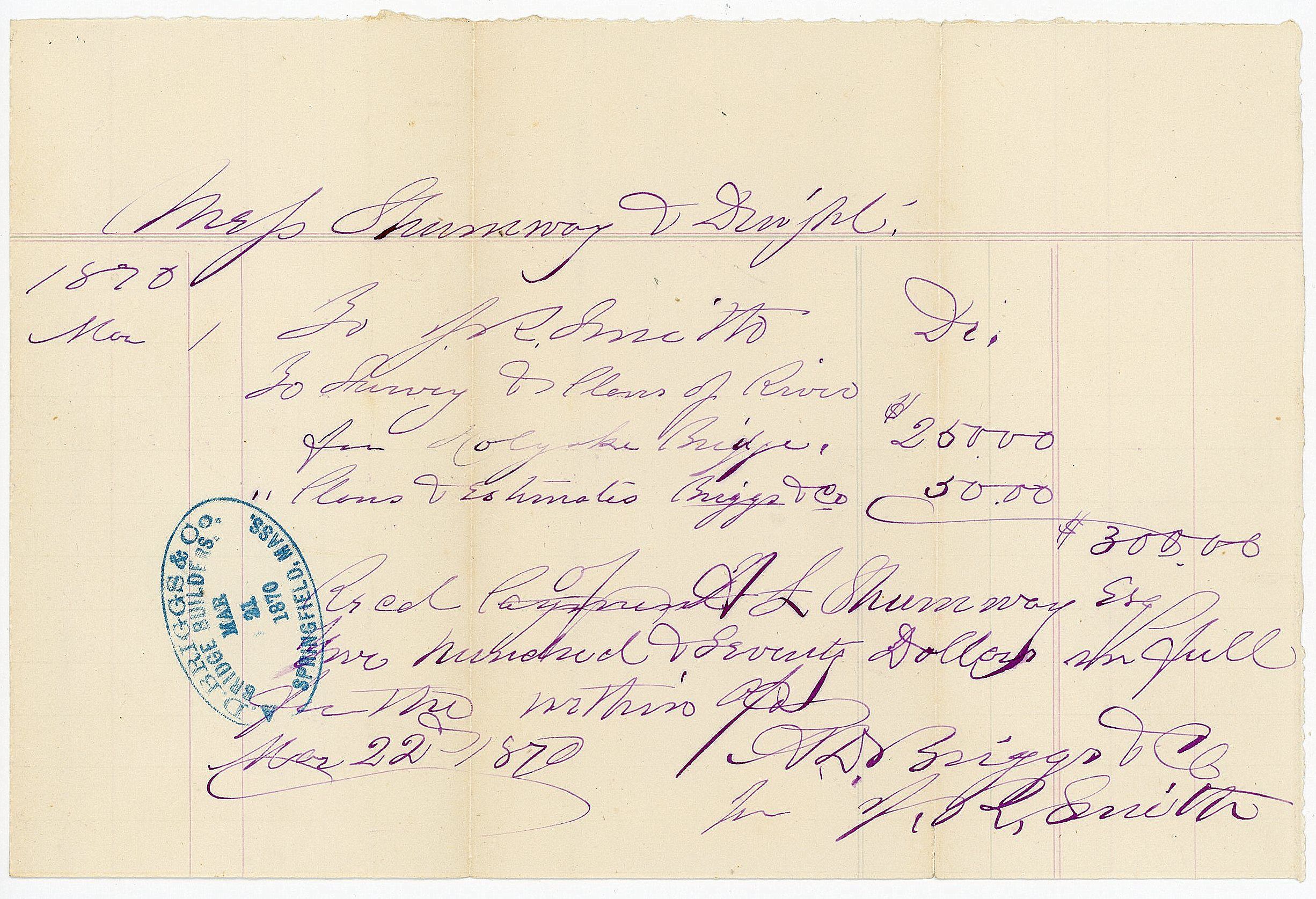 Documents associated with the early development of the Holyoke to South Hadley Falls Bridge including pledge petition, receipt for survey and plans, and bill heads for material printing and Bridge Committee dinner receipt 1870