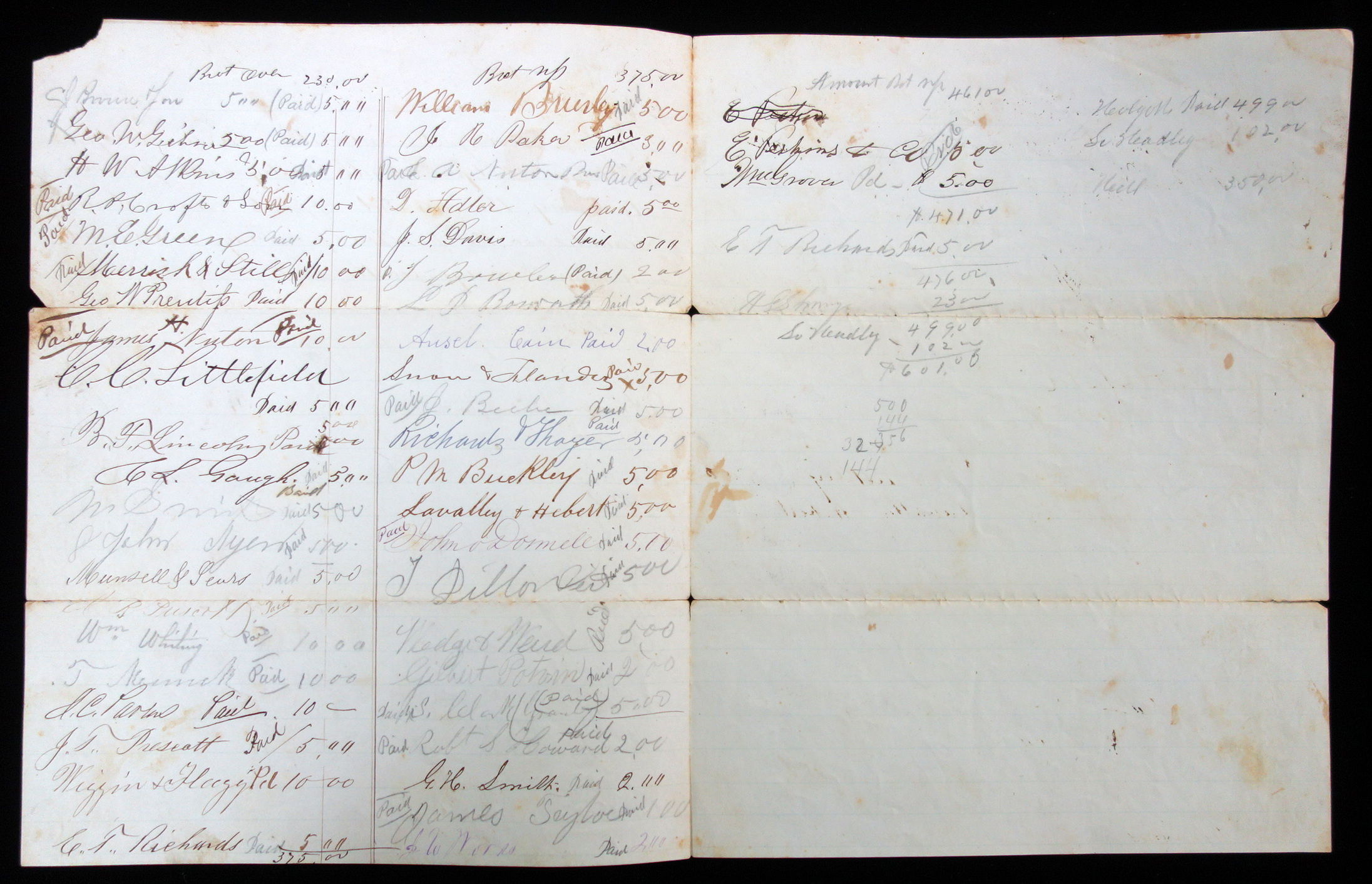 As a single-fold 9 3/4" x 7 3/4" hand written pledge petition beginning with "We the undersigned interested in a Bridge between Holyoke & South Hadley Falls promise to pay the amount opposite our respective names for the purpose of processing plans and making surveys for the same and the expenses". This is followed by 79 signatures and pledge amounts.