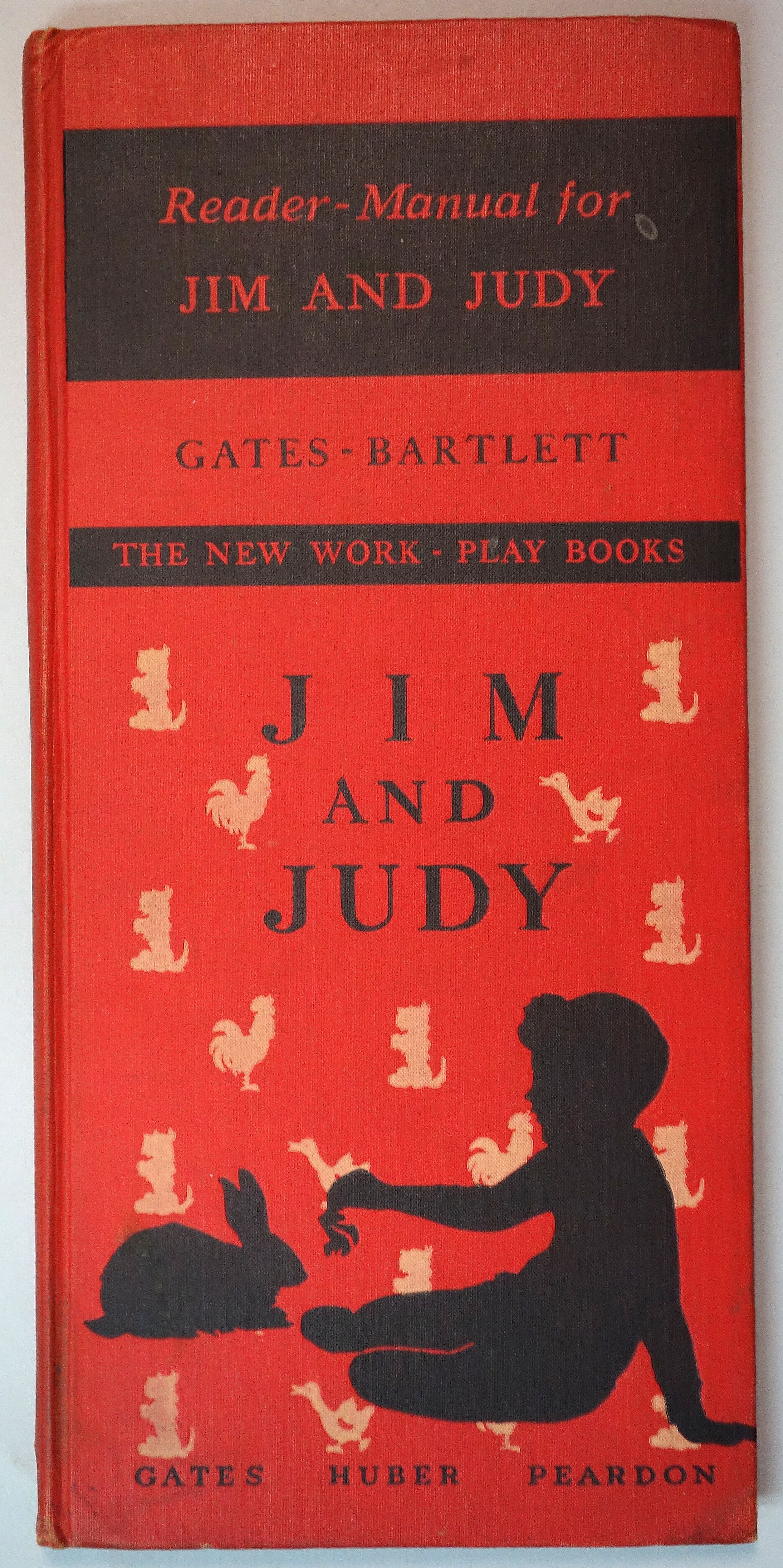 New York: MacMillan Company, 1939. First edition. Hardcover. Minimal cover wear. A 6 ¼” x 13” hard cover litho on cloth. When opened it reveals two (2) books, one above the other in the same binding. The top book is the 171 pp. Reader Manual for Jim and Judy. Contents includes The Underlying Principles of the Primer Period, Testing and Classifying Pupils and Lesson Plans.The bottom book is Jim and Judy, The New Work-Olay Books. Arthur I. Gates, Miriam Blanton Huber, & Celeste Comgys Peardon. The MacMillan Company. 1939. A 154 pp. profusely illustrated primer.