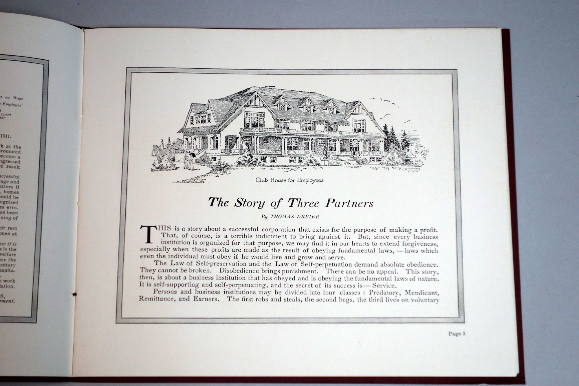 The second piece with an Egyptian motif cover is titled "The Story of Three Partners" a 50 pp booklet. The three partners are self-preservation, self-perpetuation and the secret of success "Service". A comprehensive narrative on the philosophies and workings of the company illustrated with images from photographs including not only the company's works and machinery but the recreations facilities and some of the activities available the employees.