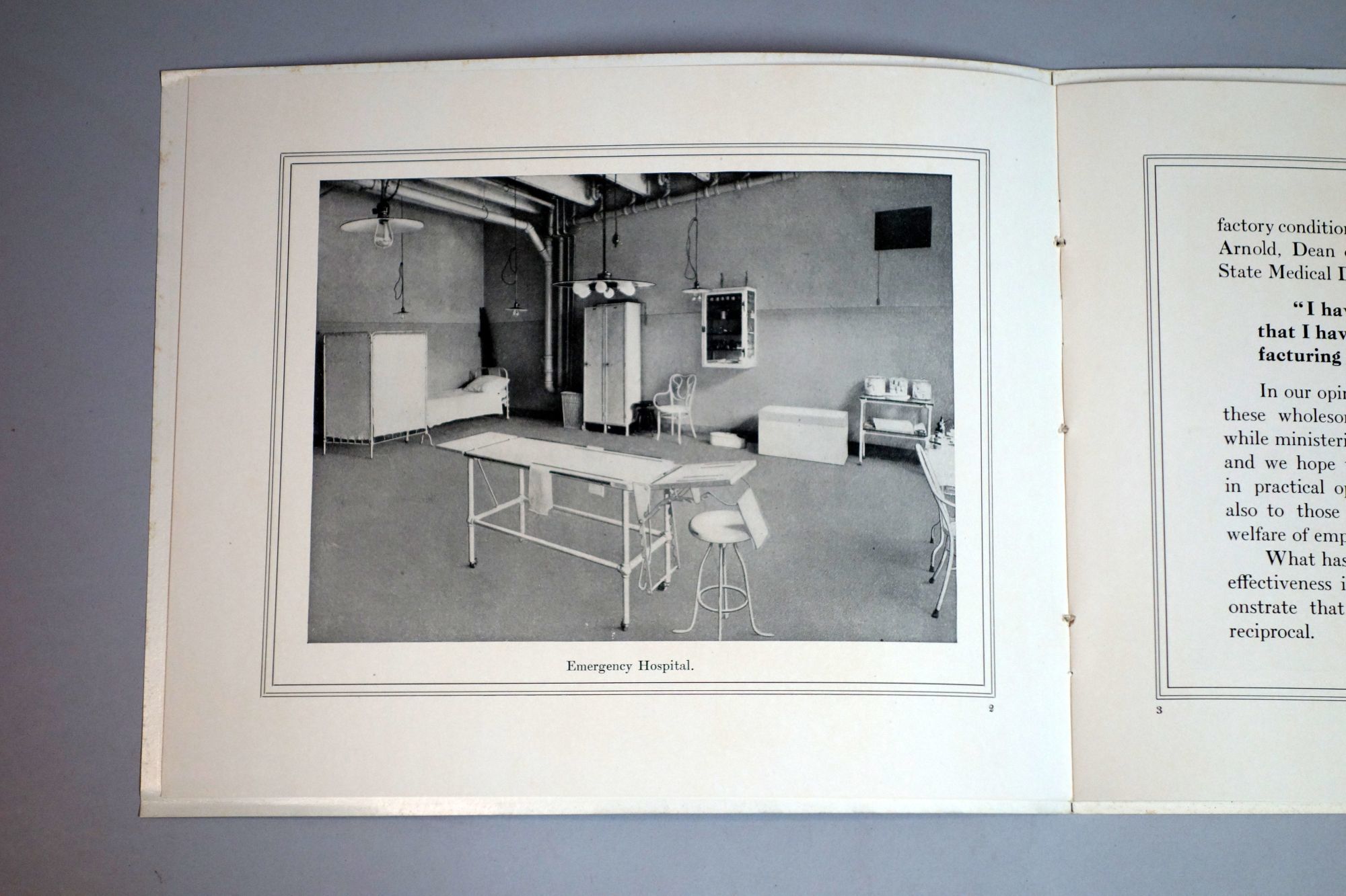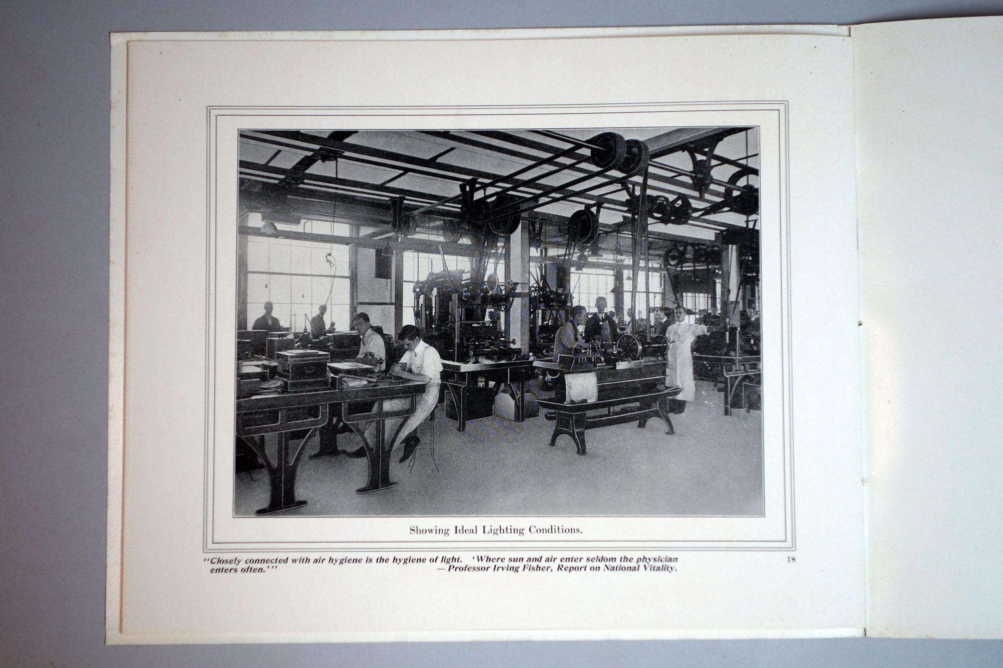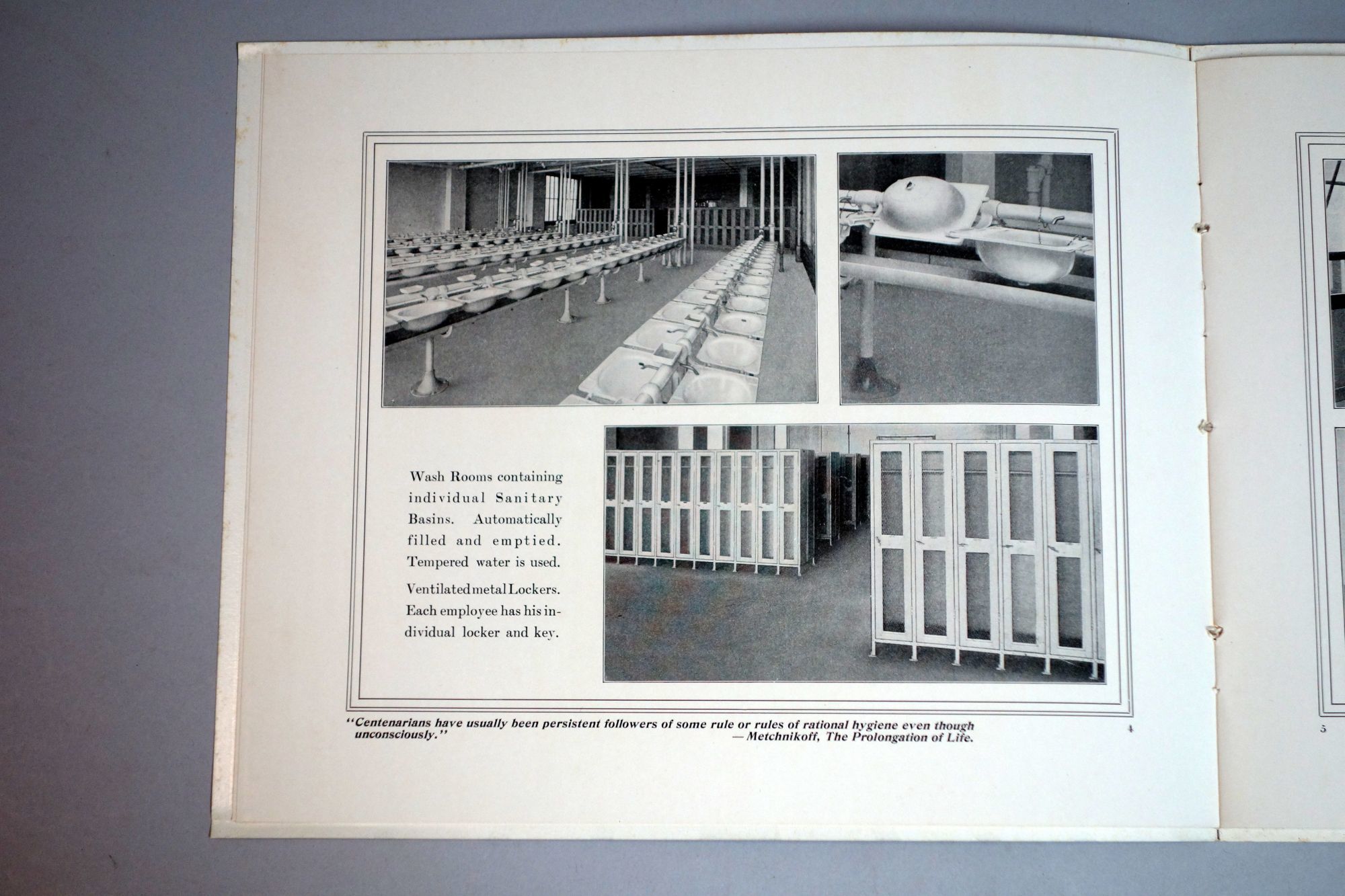 The third piece with a cover done in the style of M.C. Escher is titled "Efficiency Through Hygiene" an 18 pp booklet explaining the importance of proper light, air, heat, sanitary conveniences water and effective safety devices employed at the factory. Diagrams and images from photographs show "how simple a large plant with satisfactory conditions can be brought about". The cover illustrates the interior of a typical building drawn in exact mathematical proportions. The plant comprises sixteen building of reinforced concrete construction with floor space of more than twenty-one (21) acres.
