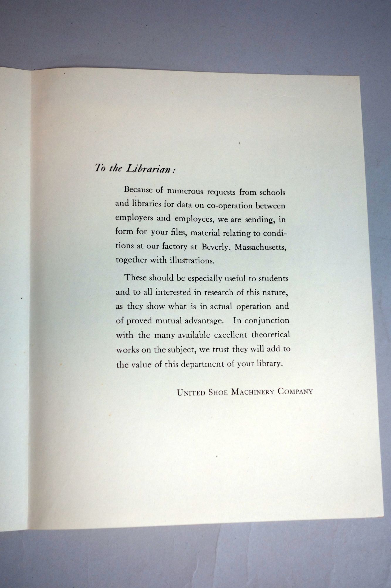 Beverly, MA, 1915. The introductory piece is addressed to Librarians explaining the purpose of the presentation as being a representation of an actual operation and of proved mutual advantages as an adjunct to all of the theoretical works on the subject found in libraries.