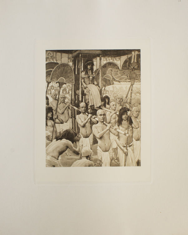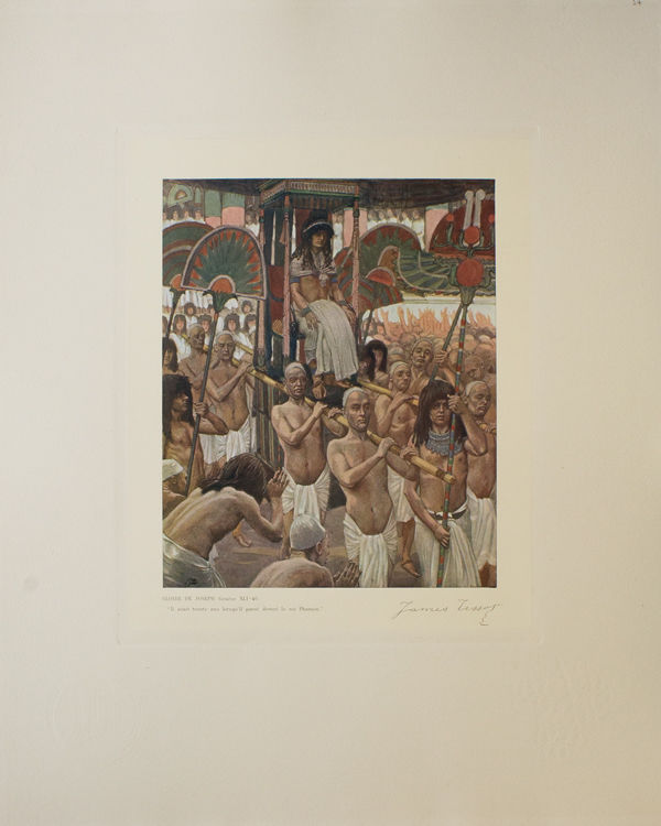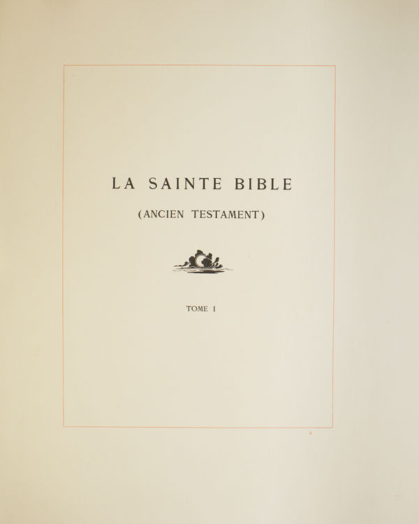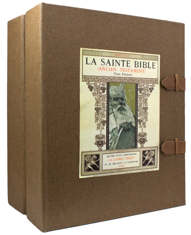 Paris: M. de Brunoff & Cie, 1904. No. 158 of 500 copies (of 560) on Marais grand vélin with plates in two states. 40 plates, each in two states (sepia and color), captioned tissue guards, 360 illustrations to text, by James Tissot. 2 vols. Folio. Loose as issued, housed in a modern cloth portfolio. Tape-repaired tears to margins of vol. I title-page and following few leaves, small, discreet embossed library stamp to vol. II half-title, large tape-repaired tear across corner of vol. II pp. 247-8, affecting text, some tears along gathering folds throughout. No. 158 of 500 copies (of 560) on Marais grand vélin with plates in two states. 40 plates, each in two states (sepia and color), captioned tissue guards, 360 illustrations to text, by James Tissot. 2 vols. Folio. The masterpiece of Tissot's late career, following a revival of his Catholic faith in 1885. Tissot traveled extensively in the Middle East to study and prepare for his Biblical illustrations. He first produced a series of watercolors on the life of Christ before turning to the stories of the Old Testament. Tissot died in 1902, and this work was completed by his six assistants.
