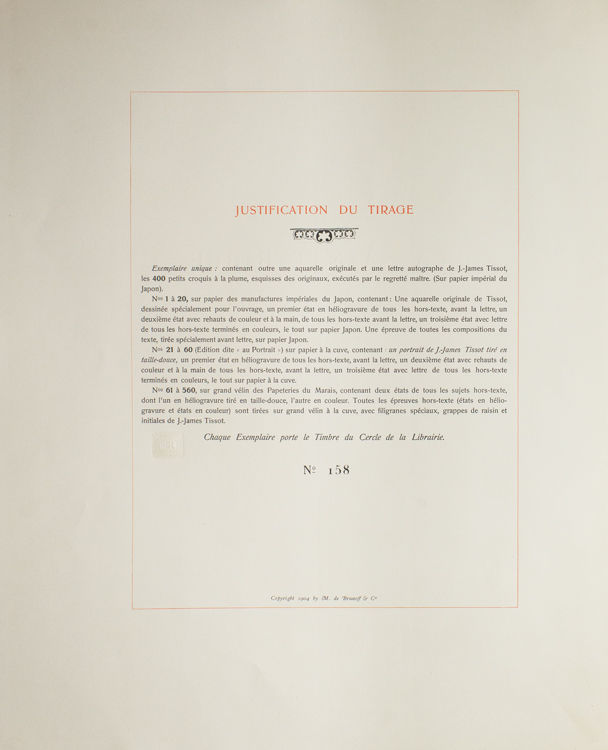 - 40 plates, each in two states (sepia and color), captioned tissue guards, 360 illustrations to text, by James Tissot. 2 vols. Fo