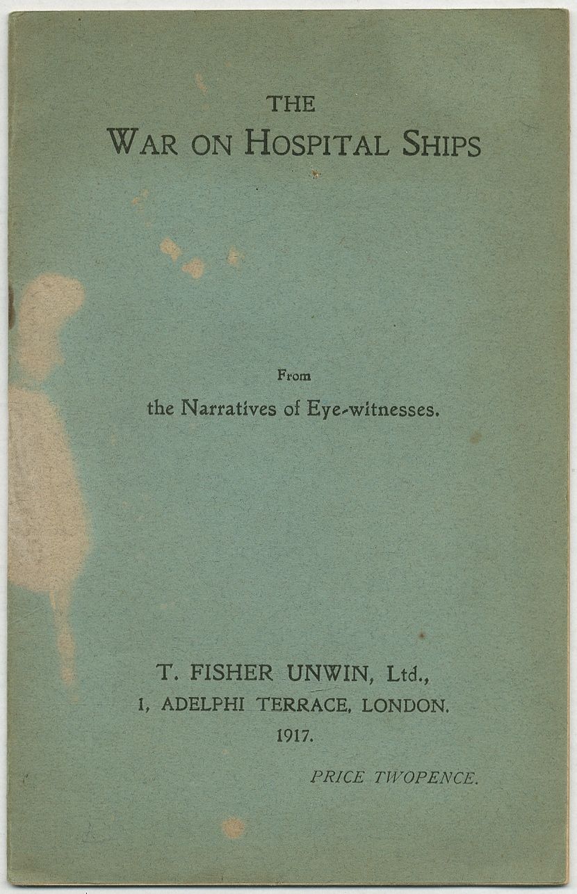 London: T. Fisher Unwin, 1917. Softcover. Very Good. First edition. Octavo. 20pp. Stapled printed green wrappers. Some spotting and color fading on the wrappers, and the staples a bit oxidized, else very good. Indictment of Triple Alliance submarine warfare against Allied hospital ships.