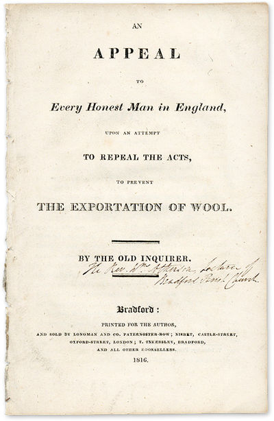 1816. Preventing an Outflow of Capital [Atkinson, William (1757-1846)]. An Appeal to Every Honest Man in England, Upon an Attempt to Repeal the Acts, To Prevent the Exportation of Wool. By the Old Inquirer. Bradford [England]: Printed for the Author, And Sold by Longman, 1816. 8 pp. Octavo (7-3/4" x 5"). Disbound, light soiling and edgewear, light spotting in a few places. Early annotation to title page identifying the author, internally clean. $250. * Only edition. A consideration of the economic effects of legislation prohibiting the export of wool, and a response to the needs of the British military during the Napoleonic Wars. Atkinson believes it would lead to an outflow of capital and a shortage of currency in Great Britain. The act was repealed without the repercussions he feared. However, The U.S. Congress enacted a protective tariff to discourage the importation of English wool. OCLC locates 4 copies, 2 in North America (Harvard, University of Chicago). Goldsmiths' Library of Economic Literature 21441.