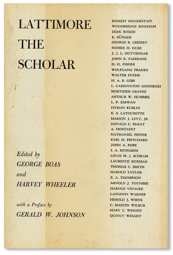 Baltimore: [The Editors], 1953. First Edition. Octavo (22.5cm.); original grey printed staplebound wrappers; 61pp. Upper wrapper unevenly toned, minor foxing, dampstain to top third of spine edges of both wrappers; contents fine. About Very Good. Collection of short articles on the scholar of Asian (especially Mongolian) studies Owen Lattimore.