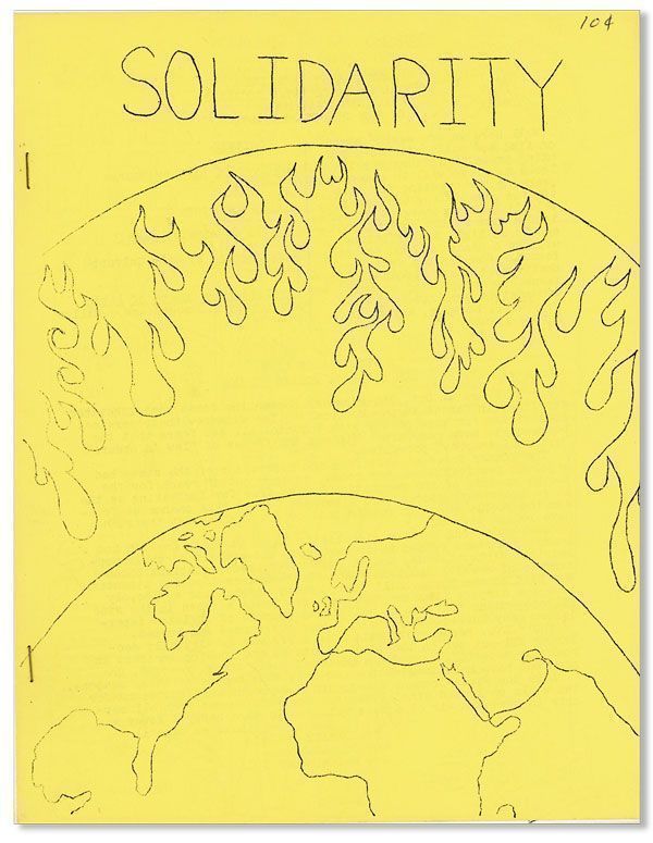 New Westminster, B.C.: Solidarity Press, n.d., ca. 1969. First Edition. Quarto (27.75cm.); original yellow pictorial staplebound self-wrappers; 8pp.; illus., mimeographed text printed on blue, white, and yellow stock. About Fine. Presumably not the first issue of this anarchist periodical, though no edition is stated. Includes contributions by George Metesky, J. Ainsley, Greg Calvert's "Jack Kerouac," and L. Gambome and J. Miller's "Revolutionary Unions of Latin America." Opening statement regarding the Montreal police strike, which took place October, 1969. One holding in OCLC as of December, 2015, at Northwestern.