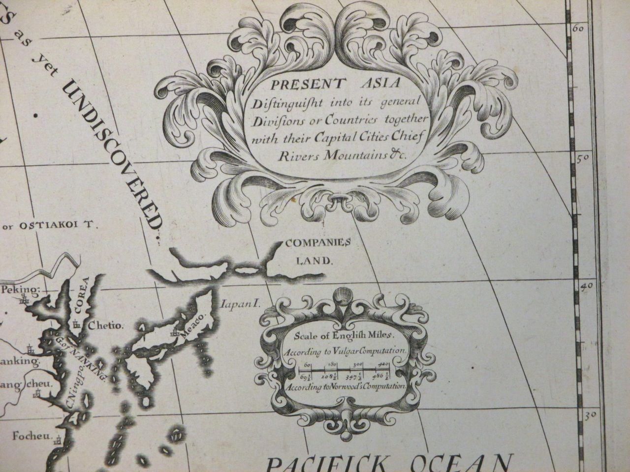This striking map of Asia depicts the continent in beautiful detail from the Mediterranean Sea and Italy east to include Japan. The geography of the encloses region is richly defined, with rivers, deltas, cities and lakes notes and with elevation rendered in profile. Particularly notable is the mapping of northeastern Asia. Lake Chimay (Chiama Lake), the mythical lake located in northern Burma which was believed to be the source of the river system in Southeast Asia is identified. The mysterious Companies Land is also identified. Company's Land and Gamma Land were considered to be the early mappings of the Kurin Islands discovered by Maerten de Vries and Cornelis Jansz Coen in 1643. They believed that these islands were part of America, which was separated from Asia by the Strait of Vries. In 1729, Bering finally debunked their myth, but the islands appeared in maps for another 50 years. The map includes beautiful cartouches. The map is in very good condition with minor wear along centerfold. Some scuffing over Bay of Bengal. Slight stains in lower quadrants. Flattened and lined with archival paper. Published in "A New Sett of Maps Both of Antient and Present Geography". Edward Wells (1667-1727), a mathematician and geographer, dedicated this atlas to the young Duke of Gloucester, son of the future Queen Anne. The Duke (age 11) was studying at Oxford at the time of printing and his tutelage may account for Wells' unusually sparse style. Instead of focusing on grand decoration, perhaps Wells used a simpler approach for educational purposes.