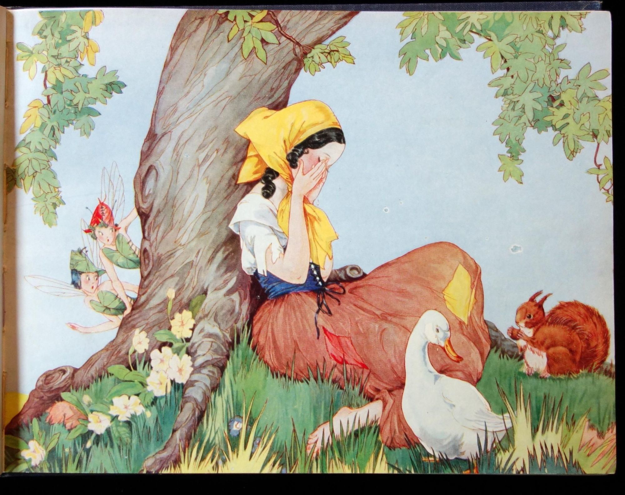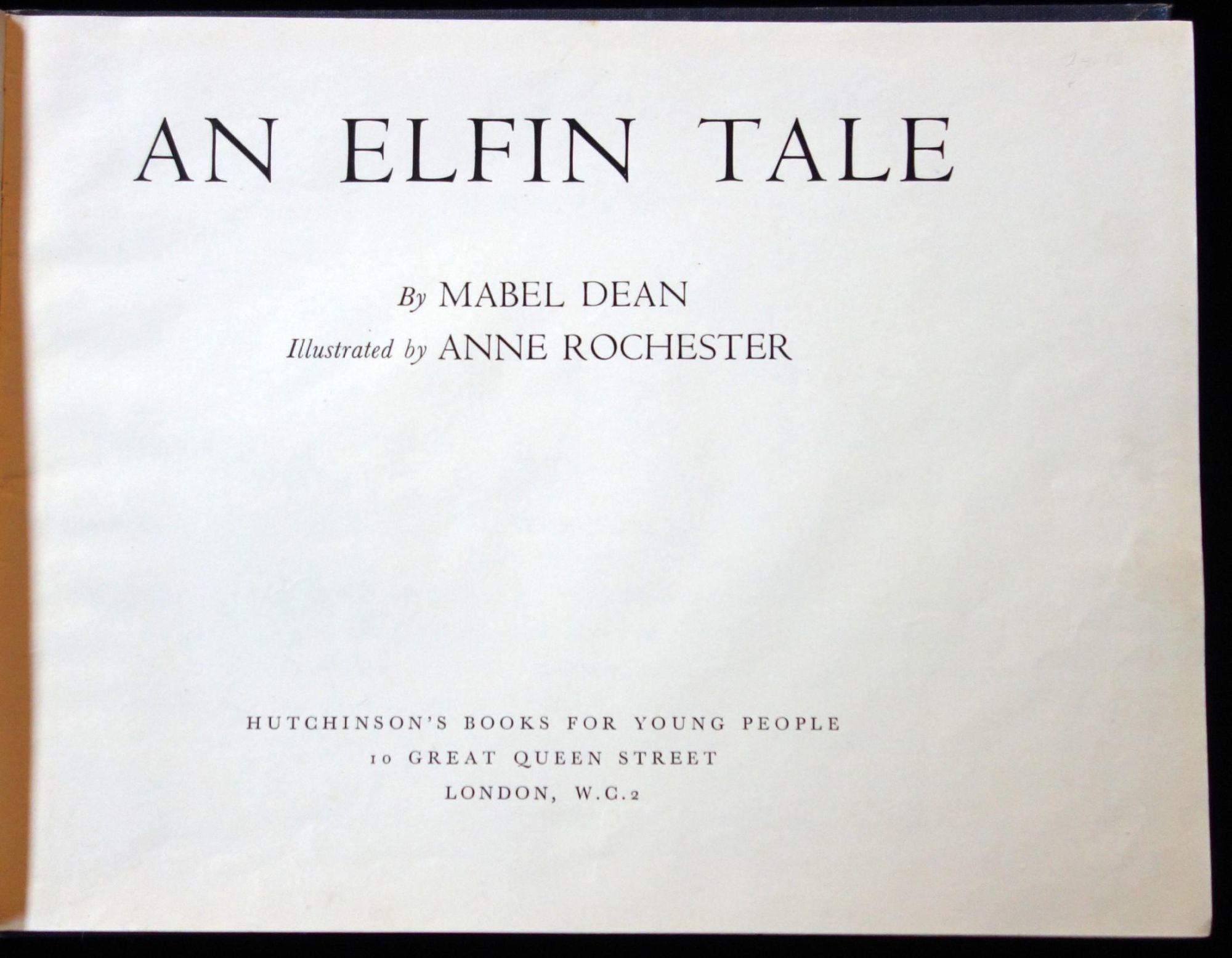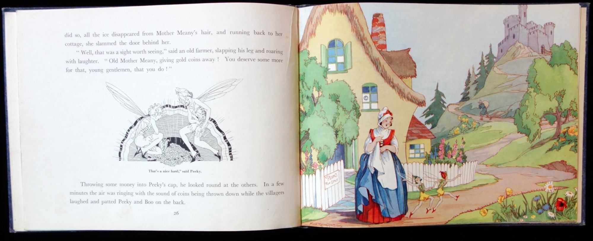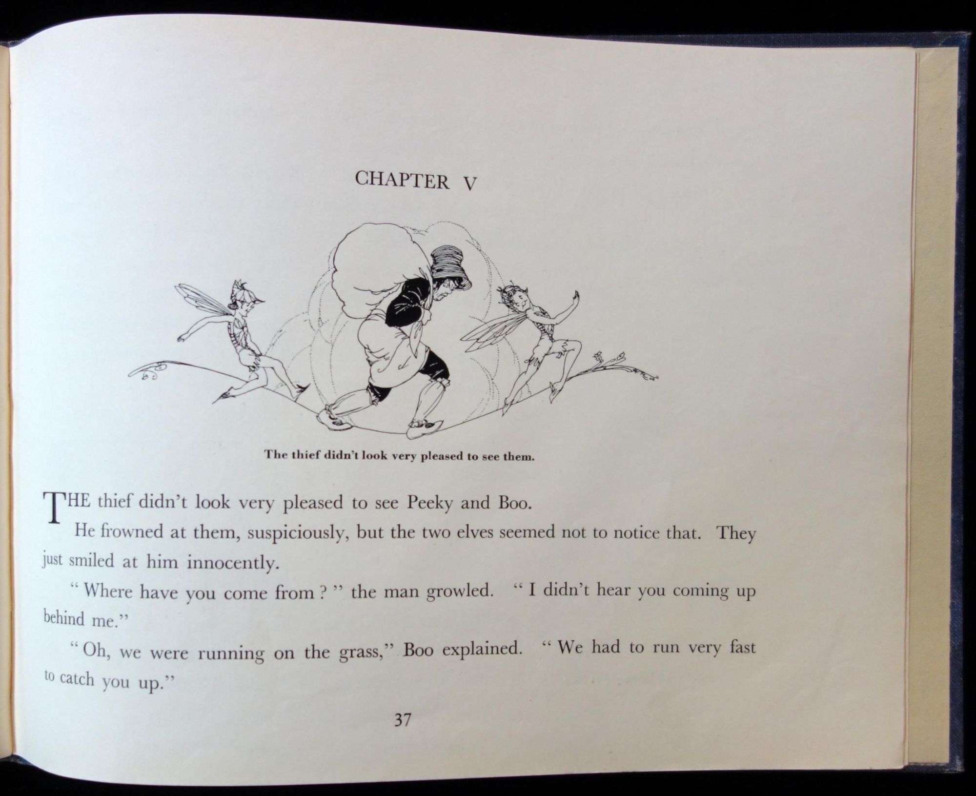 London: Hutchinson, 1946. Good. 44 numbered pages with black and white line drawings, and five full page color illustrations. The book tells the story of two 'naughty' elves Peeky and Boo, and the trouble they get into. The cover is a dark blue cloth, that shows some edge wear, particularly at the binding. The are two small stains on the back cover. Binding is loose but intact. Measures 9 1/2 x 7 1/4.
