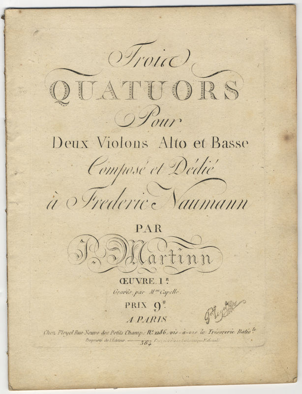 [Op. 1]. Trois Quatuors Pour Deux Violons Alto et Basse Composé [!composés] et Dédié [!dédiés] à Frederic Naumann... Œuvre 1r. Gravés par Mme. Capelle. Prix 9 livres. [Parts]