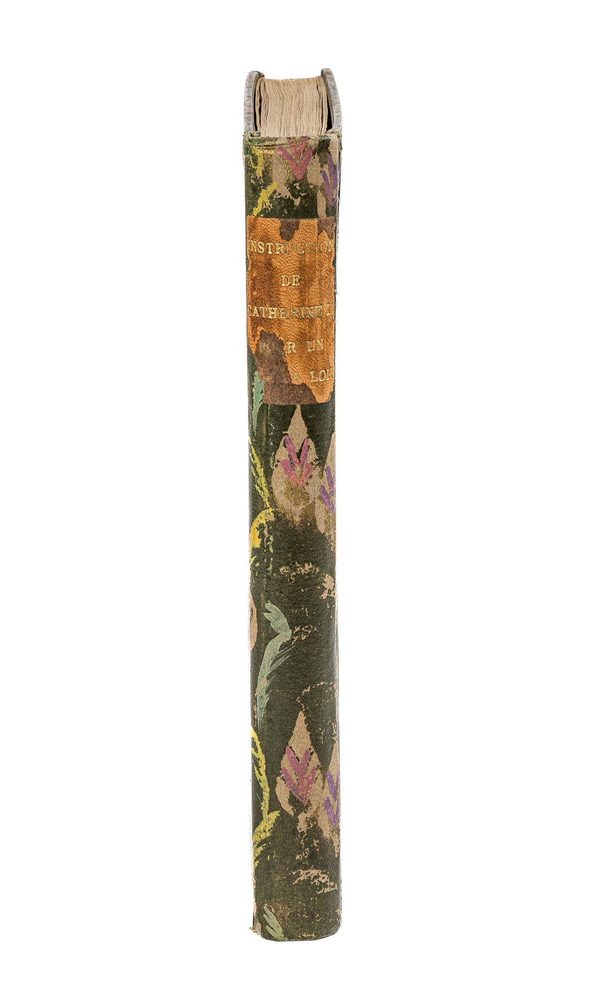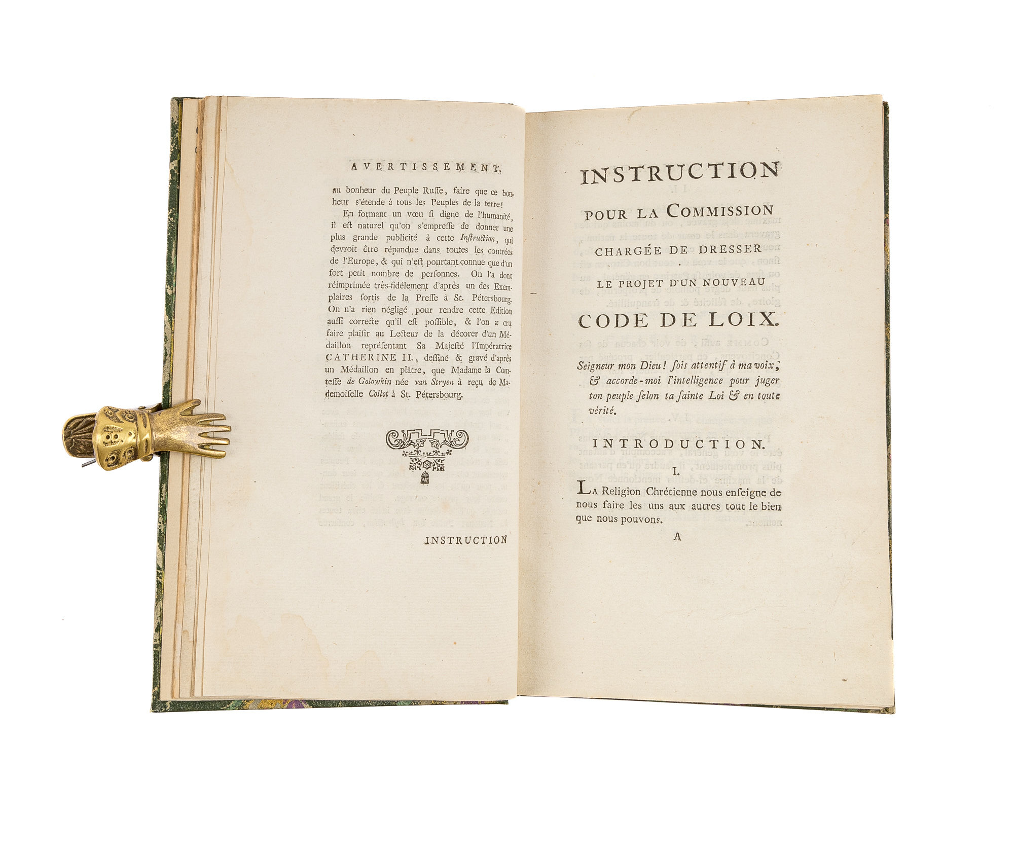 1771. Amsterdam: Chez Marc Michel Rey, 1771.. Amsterdam: Chez Marc Michel Rey, 1771. Attractive Early Amsterdam Edition of Catherine's Nakaz Catherine II [1762-1796], Empress of Russia. Instruction de Sa Majeste Imperiale Catherine II. Pour la Commission Chargee de Dresser le Projet d'un Nouveau Code de Loix. Amsterdam: Chez Marc Michel Rey, 1771. [vii], 229 pp. Copperplate portrait frontispiece. Octavo (7-3/4" x 4-3/4"). Later patterned-paper covered boards, calf lettering piece to spine, patterned endpapers. Minor wear to spine ends and corners, front joint starting at ends. Negligible light toning to text, dampstaining to bottom and fore-edges of text block, very faint in most places, in preliminaries somewhat darker. A nice copy. $1,250. * Second Dutch edition. This important text, also known as the Nakaz, or Instruction, is a statement of legal principles written by Catherine II from 1764 and 1766. Permeated with the ideas of the French Enlightenment, and copied mostly from the work of Voltaire, Montesquieu and Beccaria, it was compiled as a guide for the All-Russia Legislative Commission convened by the Empress in 1767 to create a new code to replace the 1649 Muscovite Code. Revised in consultation with Beccaria, Frederick the Great and Voltaire, the Nakaz proclaimed the equality of all men before the law and disapproved of the death penalty and torture. Unfortunately, her proposed code was never completed. Catherine's manuscript was written in French, and she later produced a Russian translation. Editions in German and Russian were published in Moscow in 1767. Several editions followed in nations ranging from Italy to Latvia. The first Dutch edition, in Dutch translation, was published in Amsterdam in 1769. The 1771 Amsterdam edition was the first Dutch edition in French. It is a scarce imprint. OCLC locates 2 copies in North American law libraries (Library of Congress, UC-Berkeley). Butler, The Nakaz of Catherine the Great 528 (entry 28).