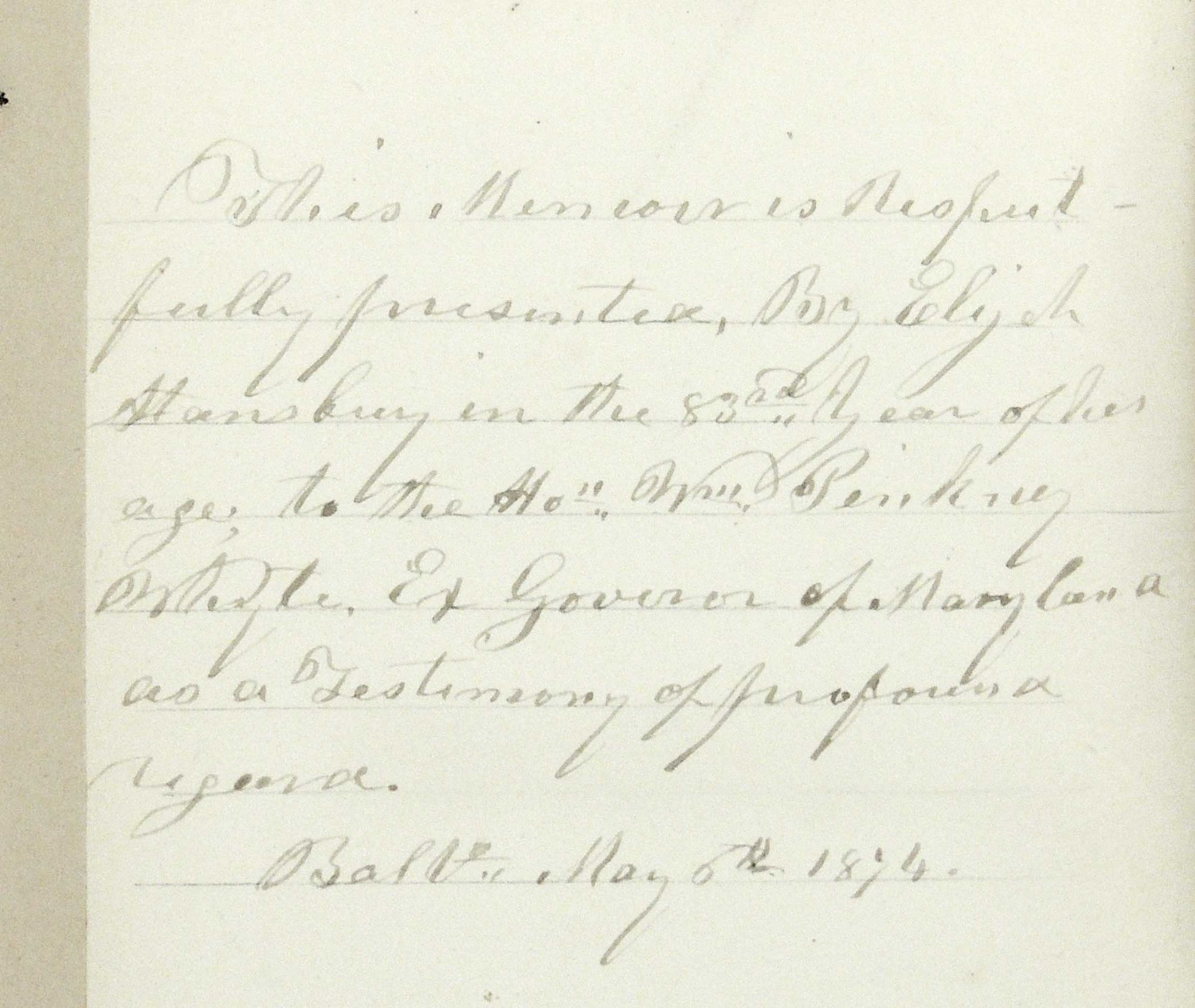 Baltimore: John Murphy & Co, 1874. Hardcover. Very Good. Hardcover. Presentation copy from Elijah Stansbury to William Pinkney. The inscription reads: "This memoir is respectfully presented by Elijah Stansbury in the 83rd year of his age to the Hon. Wm. Pinkney. Ex-governor of Maryland as a testimony of profound regard. Baltimore, Mary 6, 1874." Elijah Stansbury Jr. (1791-1883) was an American politician and soldier. He served in the War of 1812. He served in the Maryland House of Delegates from 1843 to 1845 and as Mayor of Baltimore from 1848 to 1850.