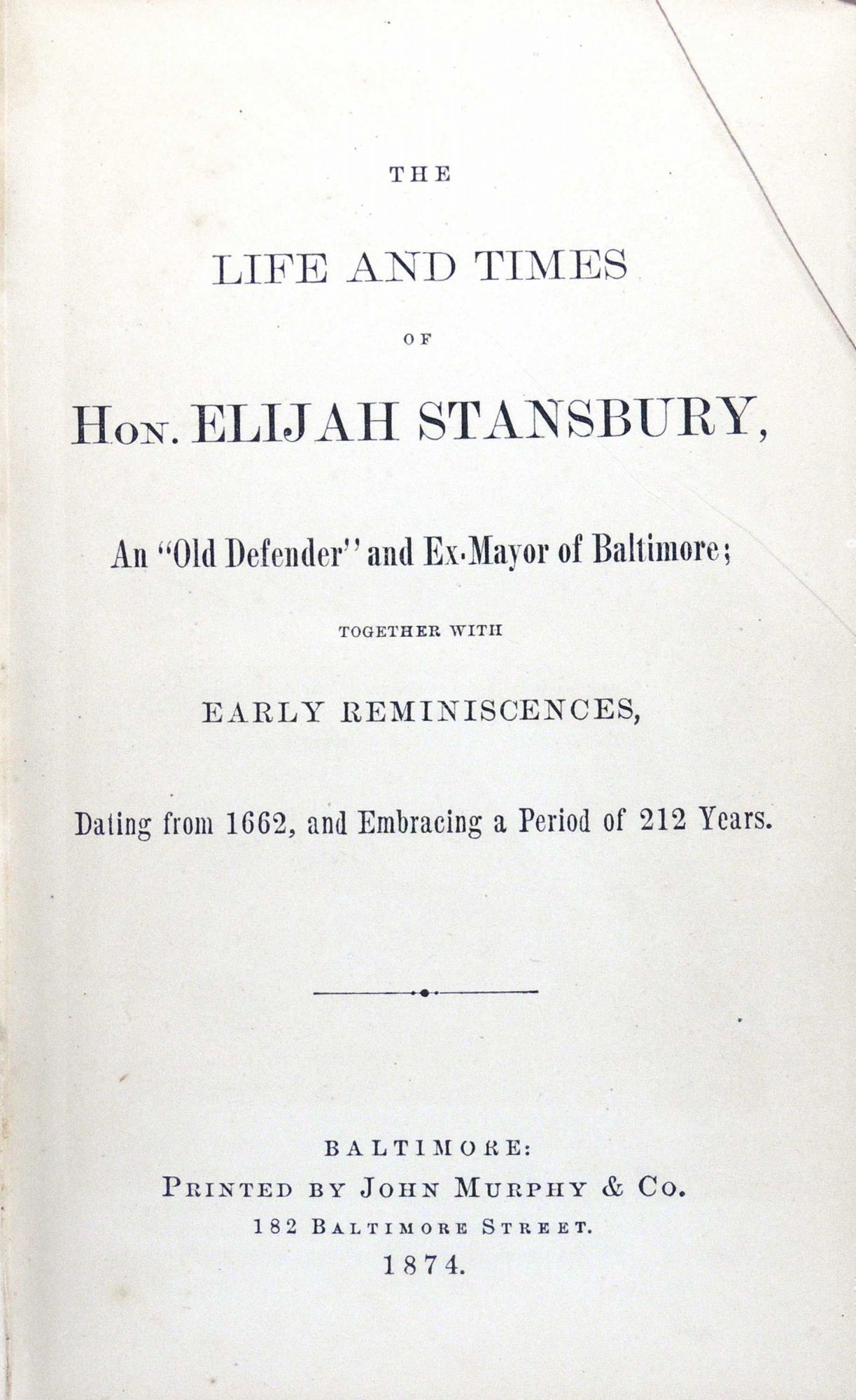The Life and Times of Hon. Elijah Stansbury, An "Old Defender" and Ex-Mayor of Baltimore; Together with Early Reminiscenes, Dating from 1662, and Embracing a Period of 212 Years